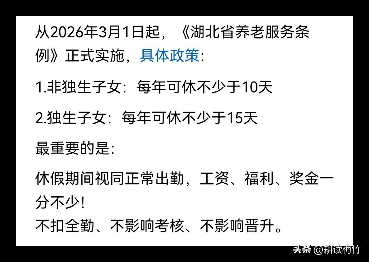 3月1日起湖北的上班族家里有老人的又可以多至少10天的带薪假期了! 湖北省养老服务条例2026年3月1日起要实施了,里面有一项福利,那就是带薪陪侍老人,非独生子女不少于10天,独生子女不少于15天。 事确实是个好事,就是不知道好不好落实,毕竟现在双休、常规的带薪休假落实都有很大的障碍,更不用说这些附加的带薪假了。 你感觉这带薪陪侍老人的假期好落实吗?