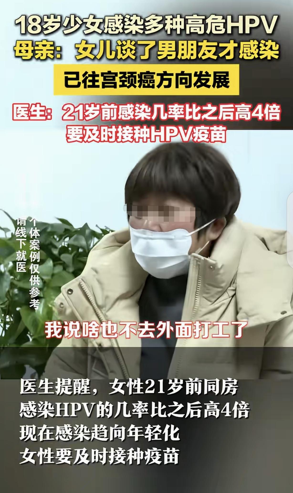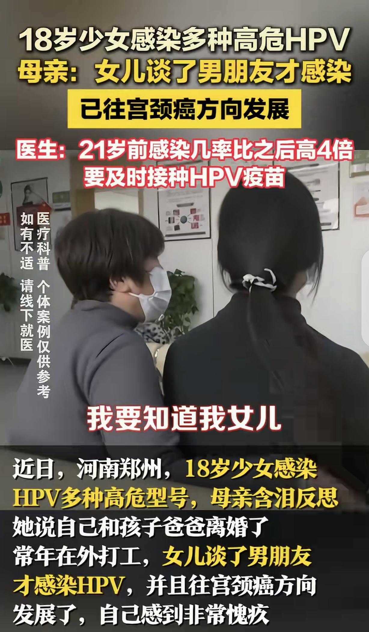 河南郑州,一18岁女子,谈了一个男友,两人亲密后,感染多种高危HPV病毒,正往宫颈癌方向发展,医生告诉女孩母亲,21岁前感染几率,要比21后高4倍。母亲崩溃大哭:我和她爸离婚后,就出去打工了,我要知道我女儿得HPV,我说啥也不去外面打工了。 一18岁的女孩,父母离婚后,母亲为了生计,把她扔在家里,出去打工去了。 女孩原本正处在青春烂漫、却架不住男人的甜言蜜语,谈了个男朋友,两人情到浓时,发生了亲密行为。 那时候的她,或许只沉浸在爱情的甜蜜里,根本没意识到危险正悄悄逼近。 没过多久,女孩的身体开始出现一些异样,起初她没太在意,以为只是普通的身体不适。 可时间一长,症状越来越严重,她这才慌了神,赶紧告诉了母亲。 母亲心急如焚,赶紧请假跑回家,带着女孩去了医院。 经过一系列详细的检查,结果犹如一道晴天霹雳,女孩感染了多种高危HPV病毒,而且病情正在朝着宫颈癌的方向发展。 医生面色凝重地告诉女孩母亲,21岁前感染HPV的几率,要比21岁后高出4倍,女孩的情况十分危急。 母亲听到这个消息,瞬间崩溃大哭。她边哭边说:我和她爸离婚后,就出去打工了,想着多挣点钱,给她更好的生活。我要是早知道我女儿会得HPV,我说啥也不去外面打工了。 母亲的话里全是自责与悔恨,她觉得是自己疏忽了对女儿的照顾和教导,才让女儿疾病缠身,可一切都晚了。 女孩听着母亲的话,眼泪也止不住地流。她心里又害怕又后悔,害怕自己的病情会越来越严重,后悔自己当初怎么就那么不洁身自爱,没有好好保护自己。 医生看着这对母女,耐心地安慰她们,同时也严肃地提醒,要及时接种疫苗,这是预防HPV感染和宫颈癌的有效手段。 医生还耐心地给她们讲解了HPV的相关知识,告诉她们虽然现在情况不容乐观,但只要积极配合治疗,还是有很大希望控制病情的。 女孩和母亲听了医生的话,就像抓住了一根救命稻草。母亲也决定,放弃打工,在老家找点活干,以后一定要多陪女儿,好好照顾她。 女孩也下定决心,以后一定要学会保护自己,不再这么糊涂。 有人说,家庭教育非常重要,18岁左右父母一定留意子女的动向,社 会很复杂。年轻轻的放纵自己,女孩子要自珍自爱,否则吃亏的只有自己! 人呀一定要自重,未婚不要在一起,结婚一定要做体检,这不是歧视女人,体检是双方都要做,这是对自己一生的负责。 自律性在强也逃避不了啦!出外旅游,洗浴中心、宾馆、酒店的被褥 床单、马桶、毛巾、都有潜在的风险。 男女都要预防,现在大部分人都有,只是低危,身体抵抗力差时,就容易感染,起初是母体携带,小孩从小就有,只是有重的,是高危,平时都是低危,小毛病,去澡堂,游泳都有可能交叉感染。 女孩因一时情感冲动,没有足够重视自我保护,陷入了健康危机,这无疑给年轻群体敲响了警钟。 女孩父母离婚,母亲外出打工,家庭教育的缺失,或许让她在面对感情时缺乏正确引导,但这绝不是她不洁身自爱的理由。 在青春懵懂期,容易被他人的甜言蜜语迷惑,可健康与未来才是最重要的。 如今,HPV感染途径多样,即便自律,也可能因公共环境等因素面临风险。 所以,无论是女孩还是男孩,都要增强自我保护意识,了解相关知识,避免不必要的亲密行为。 家长也应重视对子女的关爱与教育,不能只忙于生计而忽略孩子的身心健康。 《民法典》第1004条规定,自然人享有健康权。自然人的身心健康受法律保护。任何组织或者个人不得侵害他人的健康权。 女孩因感染高危HPV,健康权受到侵害。如果女孩的感染是因他人的故意或过失行为导致,如伴侣明知自身携带病毒却隐瞒等,那么侵害者就侵犯了女孩的健康权,应依法承担相应的民事赔偿责任,以维护女孩的合法权益。 对此,你怎么看?