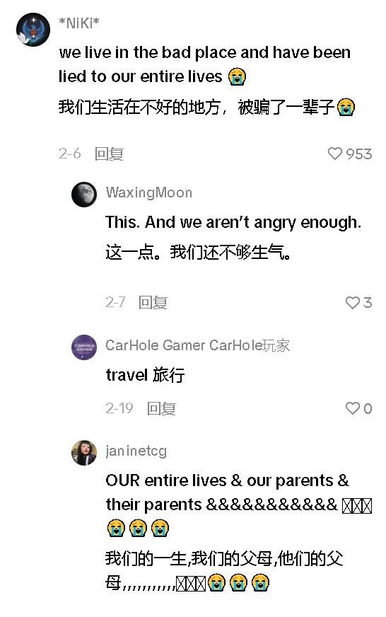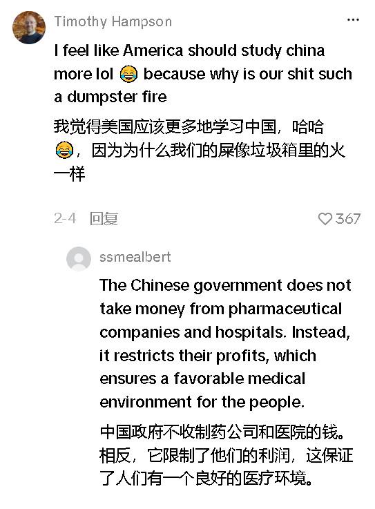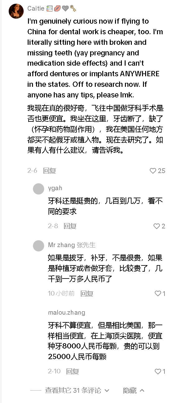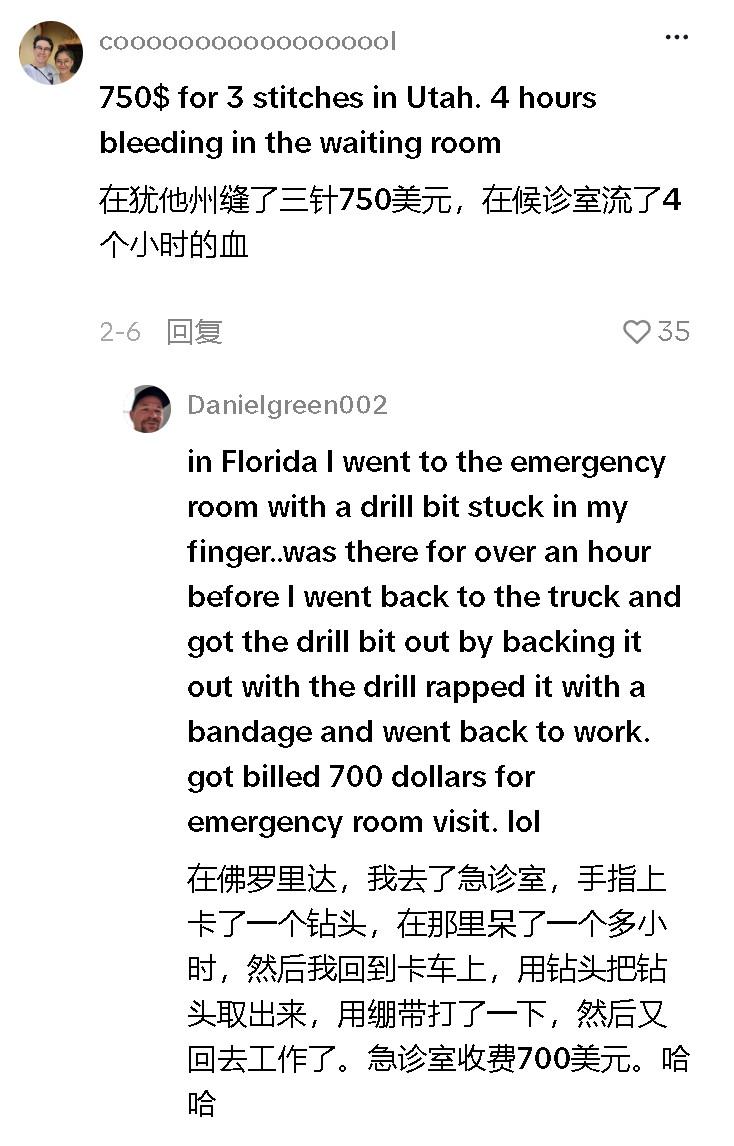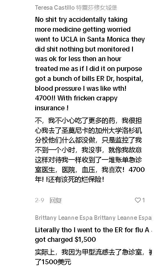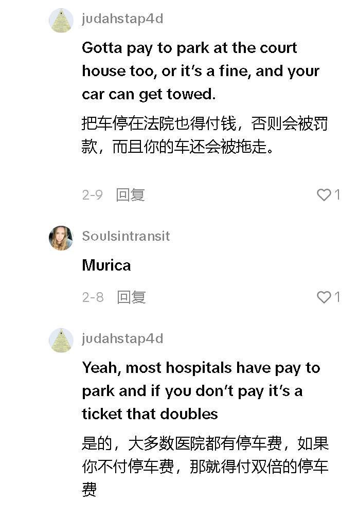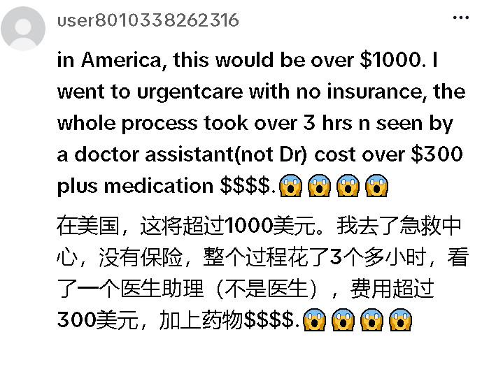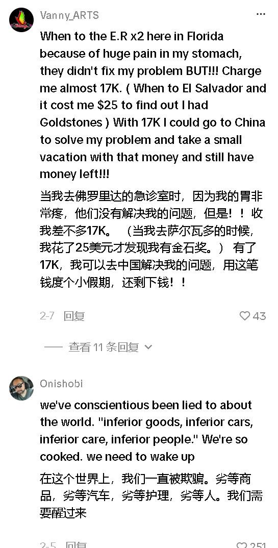 “停车30分钟最低收费12美元”……美国民众现身说法,美国生存成本高到离谱。   在洋抖上一个美国女性宣传自己来华看病的视频下方,有许多美国人留言评论:   “在德克萨斯州的休斯顿(的一个医院),仅仅30分钟的自助停车就需要12美元起”。   “把车停在法院也得付钱,否则会被罚款,而且你的车还会被拖走”。   “大多数医院都要付停车费,如果你不付停车费,那就得付双倍的停车费”。   “A:我咳嗽一次就被收了1500美元”。   “B:往返中国一次要花1200美元”。   “C:就当享受假期”。   “D:太便宜了,兄弟,我朋友晕了叫了救护车,医院收了他3000,他们只给了他一杯佳得乐”。   “E:我有次不小心服药过量,我很担心,就去了圣莫尼卡的加州大学洛杉矶分校医院,他们什么都没做,只是观察了我不到一个小时,我没事,然后我收到了一堆账单……4700美元! 还有该死的烂保险!”。   “F:我因为甲型流感去了急诊室,被收取了1500美元”。   还有美国民众调侃说:“请把这个(去天朝看病)做成超级碗广告(老美最大最有影响力的赛事)”,底下评论纷纷附和。   “我们生活在不好的地方,我们被骗了一辈子”。   “是的!我们被骗了;这叫做宣传。其目的是保持我们现有的制度”。   “去年我是美国人,看到这么好的国家到处都是我们没有的东西,我感到很尴尬”。   还有个可怜的女士正在被医疗问题困扰,她寻求建议说:“我现在真的很好奇,飞往天朝做牙科手术是否也更便宜?我坐在这里,牙齿断了,缺了(怀孕和药物副作用),我在美国任何地方都买不起假牙或植入物。如果有人有什么建议,请告诉我。”下面天朝民众纷纷留言给她出主意。   “我去佛罗里达急诊,因为我的胃非常疼,他们没有解决我的问题,但是收了我差不多17000美金, 当后来我去萨尔瓦多,花了25美元才发现有胃结石。有这17000美元,我可以去天朝解决我的问题,用这笔钱度个小假期,还能有多余的钱!”   “在犹他州缝了三针750美元,在候诊室流了4个小时的血”。   “在佛罗里达,我去了急诊室,手指上卡了一个钻头,在那里呆了一个多小时(没排到号),然后我回到卡车上,(自己)用钻头把钻头取出来,用绷带打了一下,然后又回去工作了。急诊室收费700美元。哈哈”   “我需要根管和牙冠。在芝加哥,牙医要价2500。我去了西班牙的塞维利亚,一切都办好了,加上机票,花费不到1400美元”   总之太多了,老表们自己去看吧。