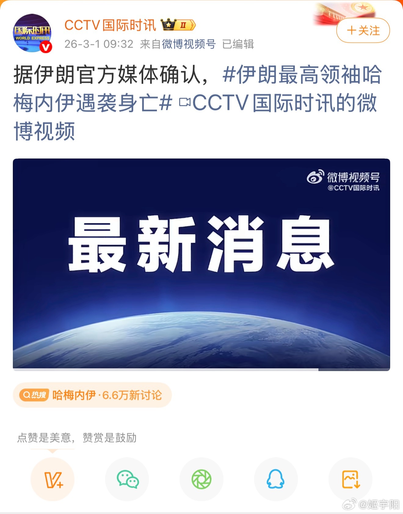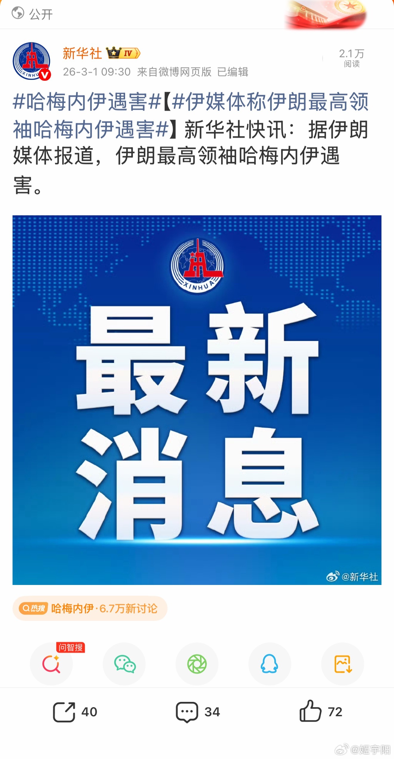 新华社和央视已经发布,来自伊朗媒体的消息,应该是证实了稍早之前媒体的报道。