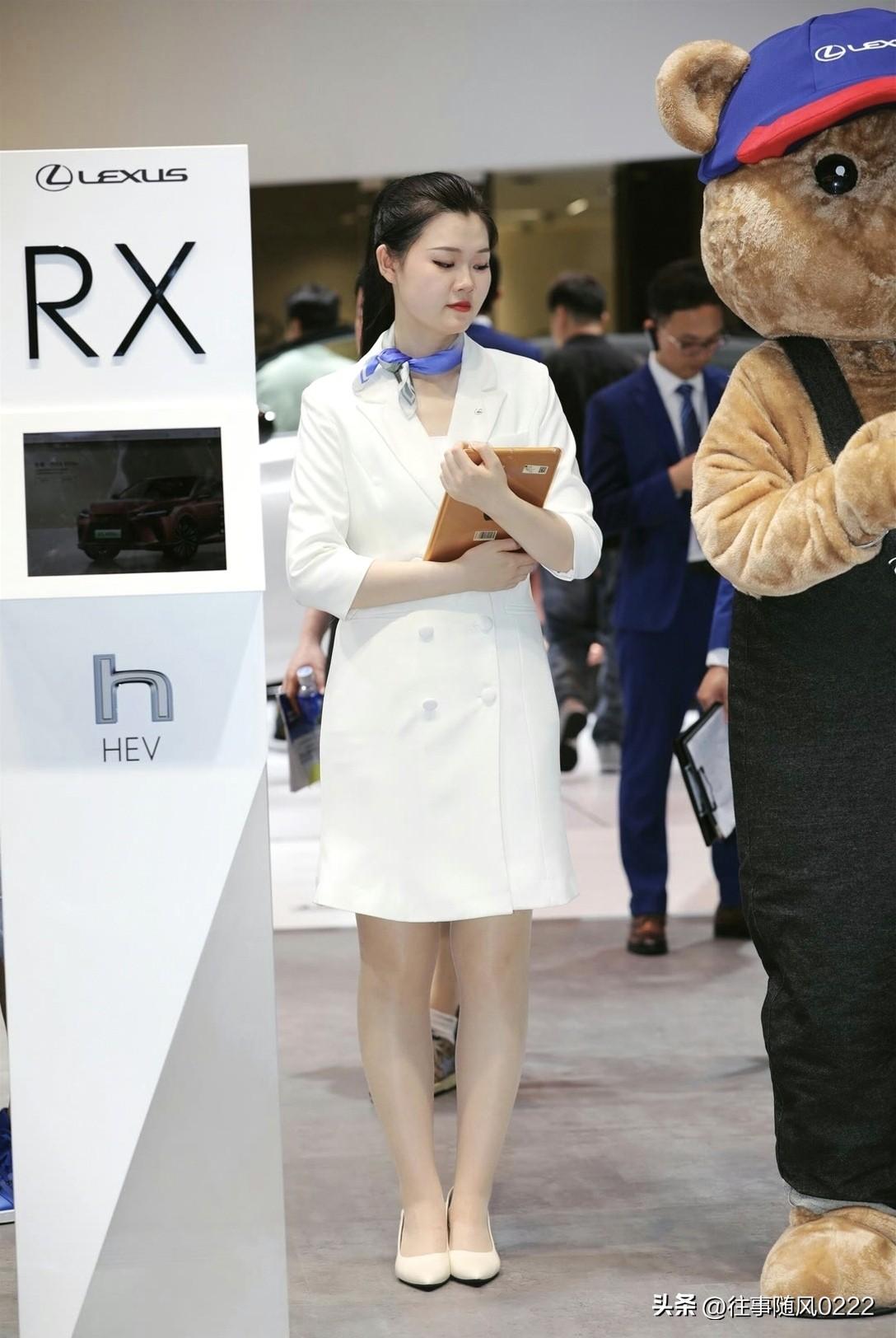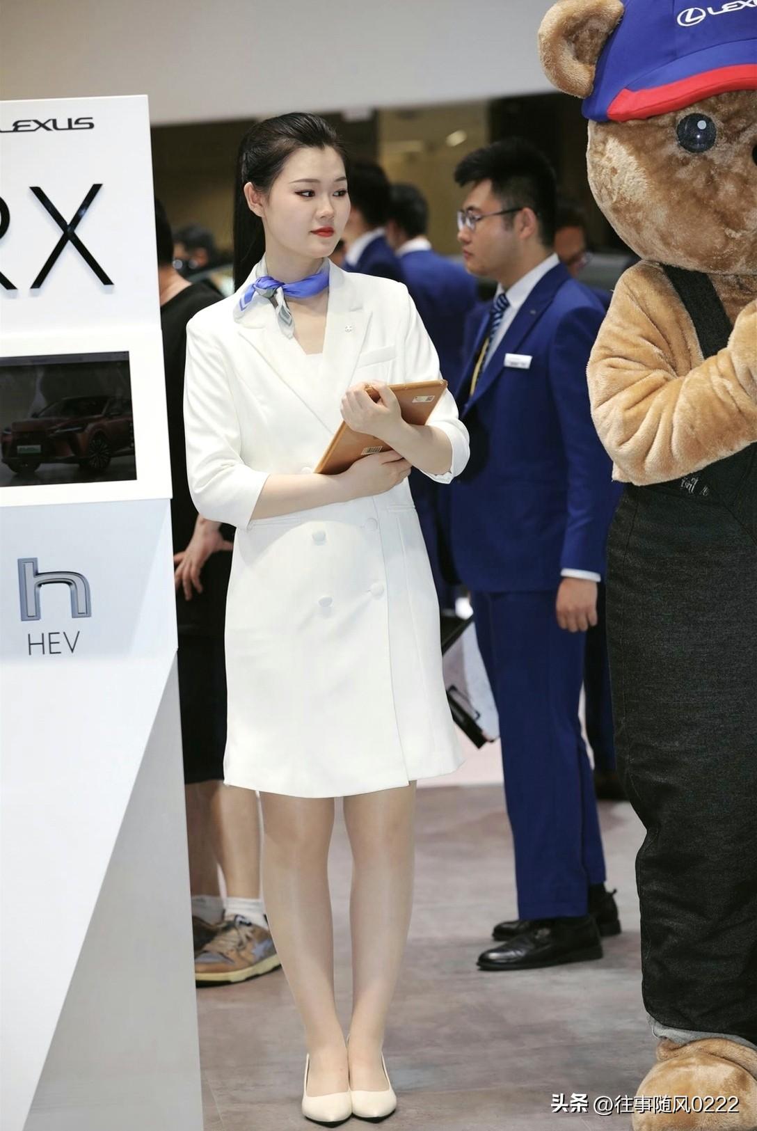 优雅车展现场,白衣女子手持平板,引人注目
