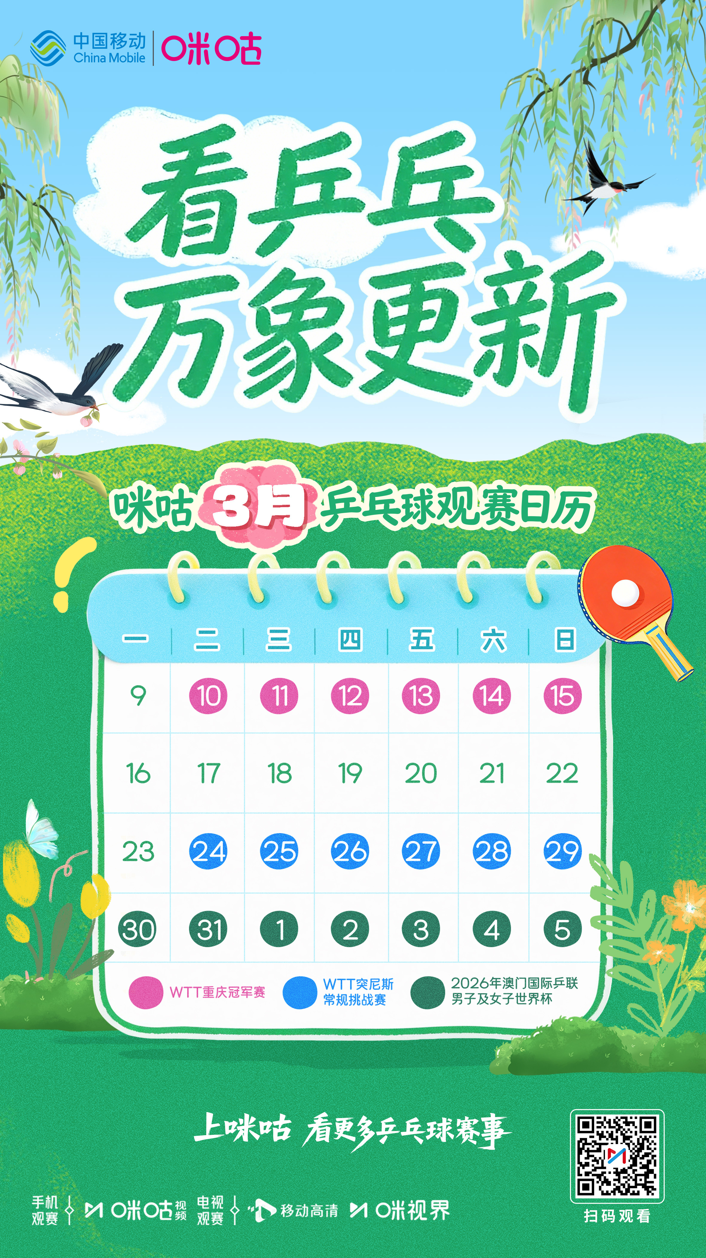 📢 咪咕3️⃣月乒乓球观赛日历❤️🔥 WTT重庆冠军赛热辣来袭💪 单打世界杯中国澳门开打🍃 春日万象更新 #看乒乓上咪咕# 🔗 网页链接