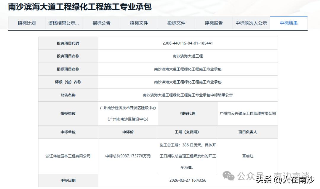 【南沙情侣路升级来了!】南沙情侣路已经打通,慢行系统也已经有很多市民体验过,纷纷叫好。不过车行道目前正在施工,而现在南沙市民一直期待的情侣路绿化公园部分也终于要来了。 2月27日,南沙滨海大道工程绿化项目施工专业承包的中标结果正式揭晓,浙江伟达园林工程有限公司凭借出色实力成功中标。该项目中标总价高达5087.173778万元,施工总工期为386个日历天。 比较有意思的是,本次中标的竟然不是南沙和广州本地的企业,而是来自一个浙江的企业。根据介绍浙江伟达园林工程有限公司成立于2004年,总部位于杭州市萧山区,注册资本5080万元,是国家城市园林绿化、园林古建、城市及道路照明工程三项壹级资质的综合性施工企业。公司前身为浙江伟达建设工程有限公司,承建了杭州西湖长桥溪截淤整治工程(获中国人居环境范例奖与迪拜国际改善居住环境最佳范例奖) 、第九届中国国际园林博览会杭州园等标志性项目。经验还是十分丰富的。 而从公司官方号可以查到的内容不多,但是看到2023年参与了亚运会火炬传递沿线的环境提升工程,还有G20项目等等。 期待这次的浙江过来的过江龙可以给南沙带来和以往不一样的绿化品质吧!要知道南沙以往的部分工程,效果图做的是很不错的,但是实际落地效果就缩水严重,验收也不太严谨。这次希望会不一样吧!