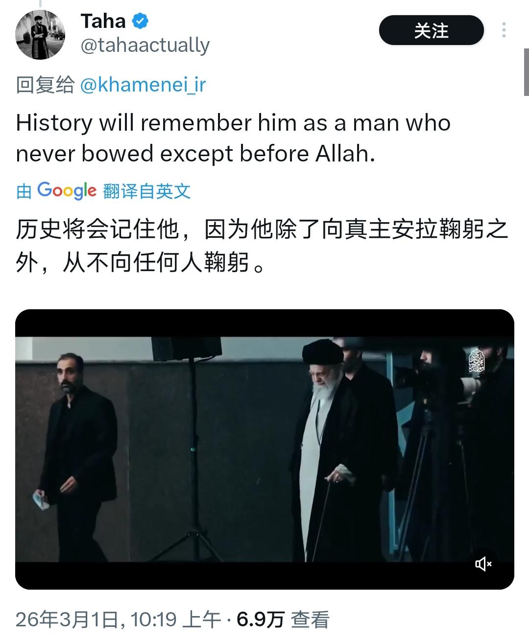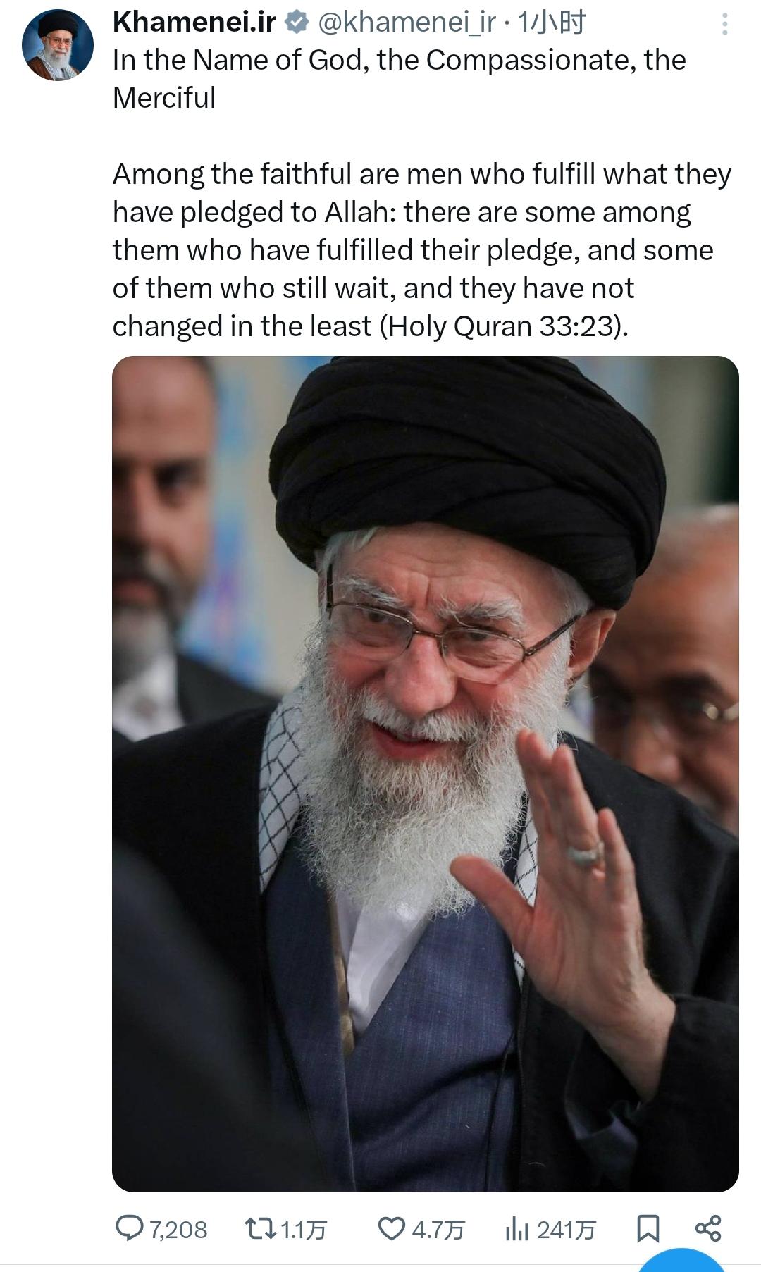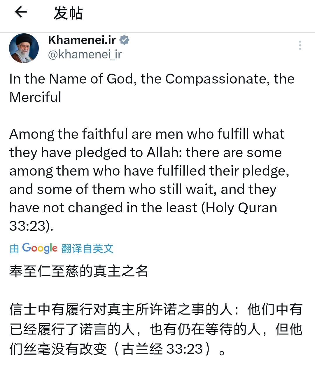 哈梅内伊的临终遗言! 这或许是哈梅内伊人生的最终章,他的官推这样写道: 奉至仁至慈的真主之名 信士中有些人已履行他们与真主缔结的盟约:他们中有成仁的,有待义的,他们没有变节(《古兰经》33:23)。 是的,你可以不喜欢他,甚至诅咒他,但历史会记住每位不对霸权下跪的英雄。 Source: X