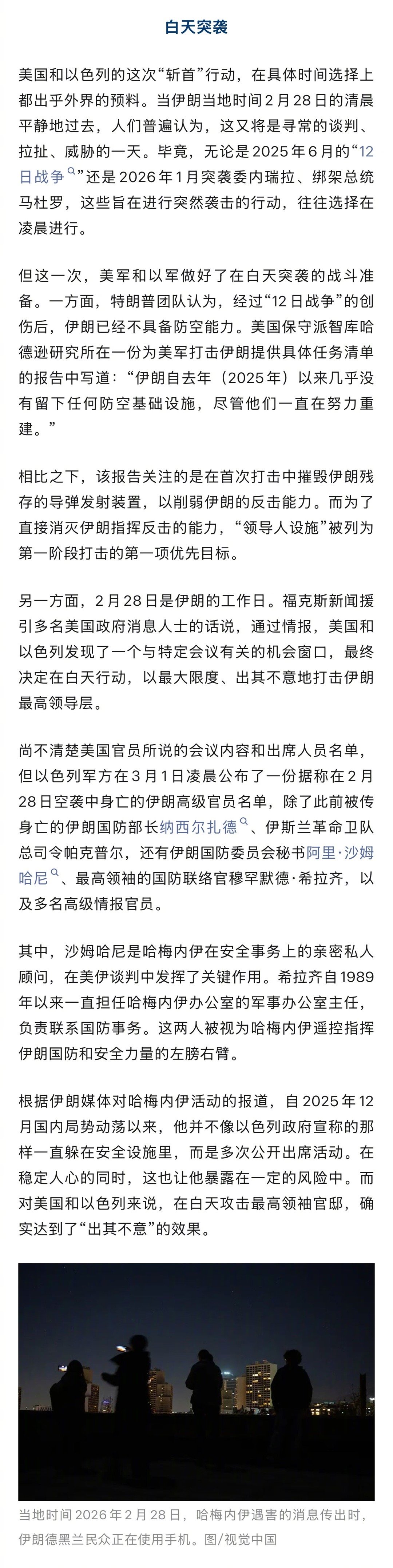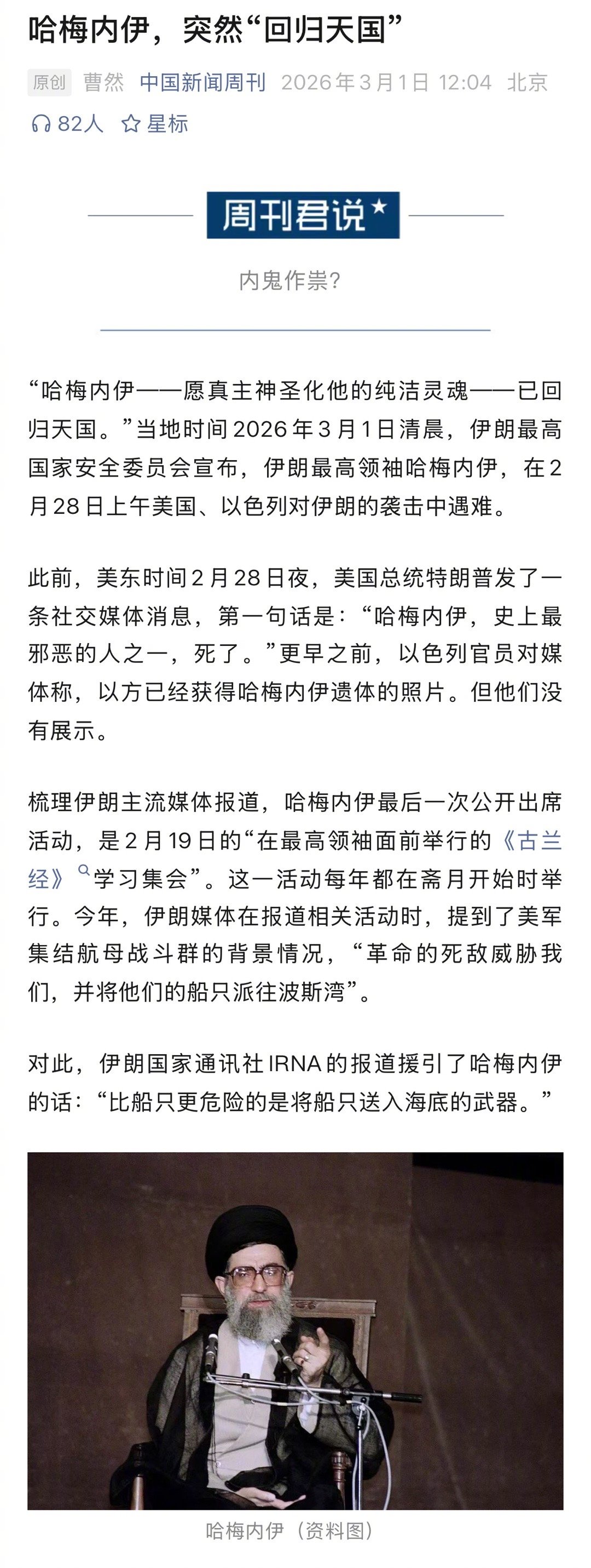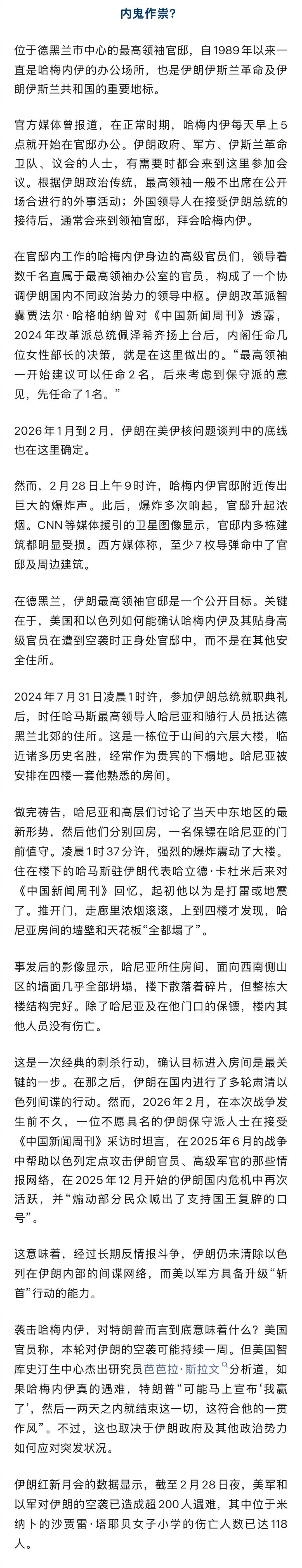 #哈梅内伊遇害#【中国新闻周刊:#哈梅内伊遇袭身亡或是内鬼作祟#】#以色列在伊朗内部间谍网仍未被清除# “哈梅内伊——愿真主神圣化他的纯洁灵魂——已回归天国。”当地时间2026年3月1日清晨,伊朗最高国家安全委员会宣布,伊朗最高领袖哈梅内伊,在2月28日上午美国、以色列对伊朗的袭击中遇难。