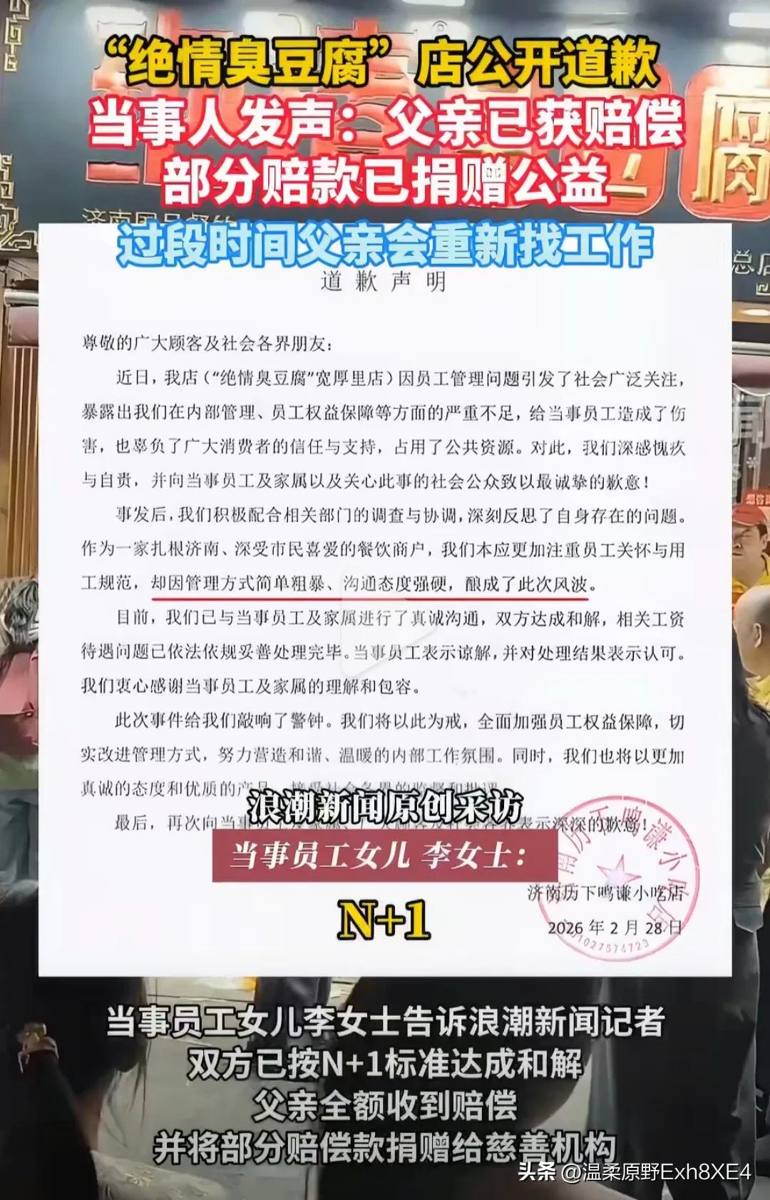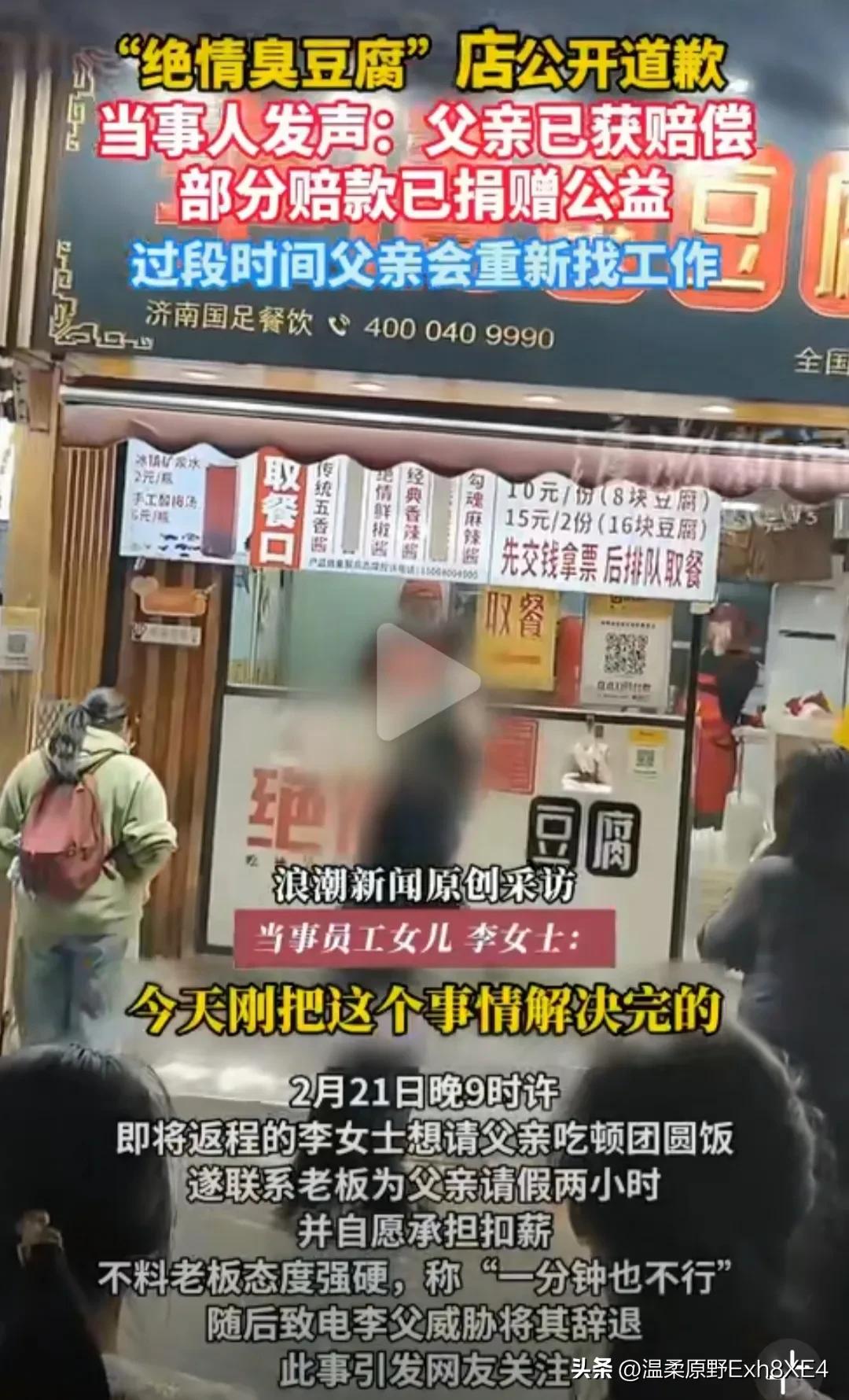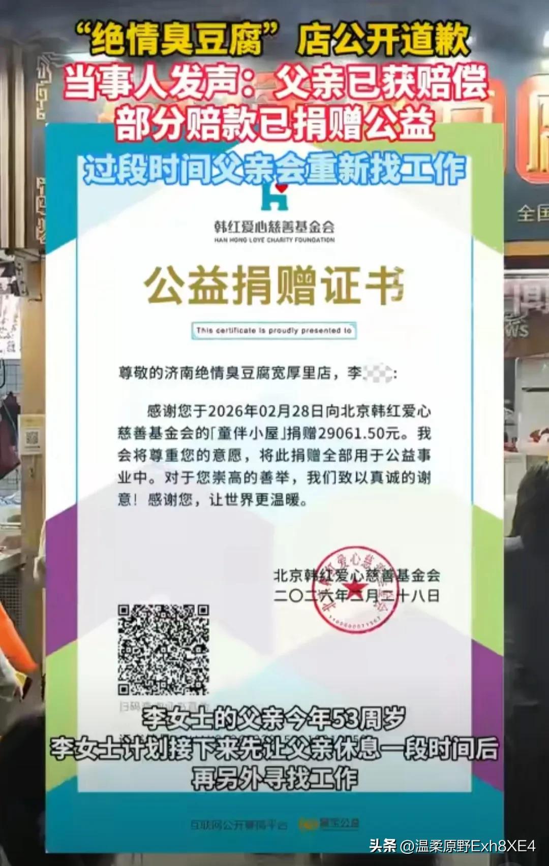 绝情臭豆腐店老板终于不“绝情”了,在当地人社局和街道介入后,公开道歉,并赔偿李父N+1约3万元。 而李父一家讨回公道后,却扭头将29061.5的赔偿款捐给了韩红慈善基金会。这也许就是咱老百姓最质朴的天性吧,出来工作,除了钱,更看重的是人与人交往的那份人情味。