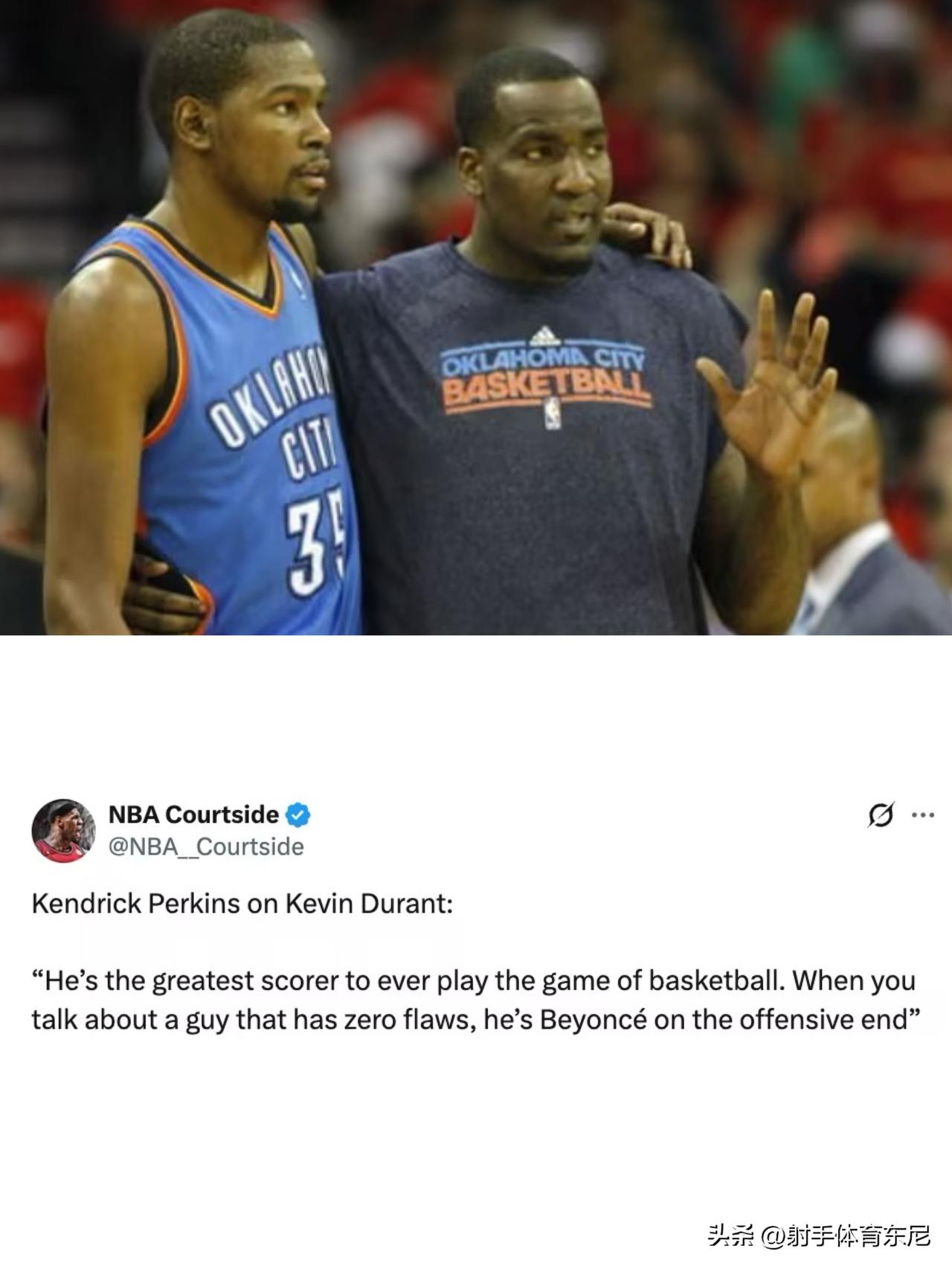 前雷霆队友,现ESPN评论员帕金斯夸奖“死神”杜兰特,表示:“杜兰特就是篮球史上最伟大的得分手,他是一个没有任何缺陷的球员,他在进攻端就像碧昂丝(美著名说唱歌手、演员)一样,完美无瑕。” 帕金斯之前一直吹捧的是勒布朗-詹姆斯,如今怎么吹捧起了杜兰特?是詹姆斯忘了续费?还是杜兰特充值了?[尬笑][尬笑]