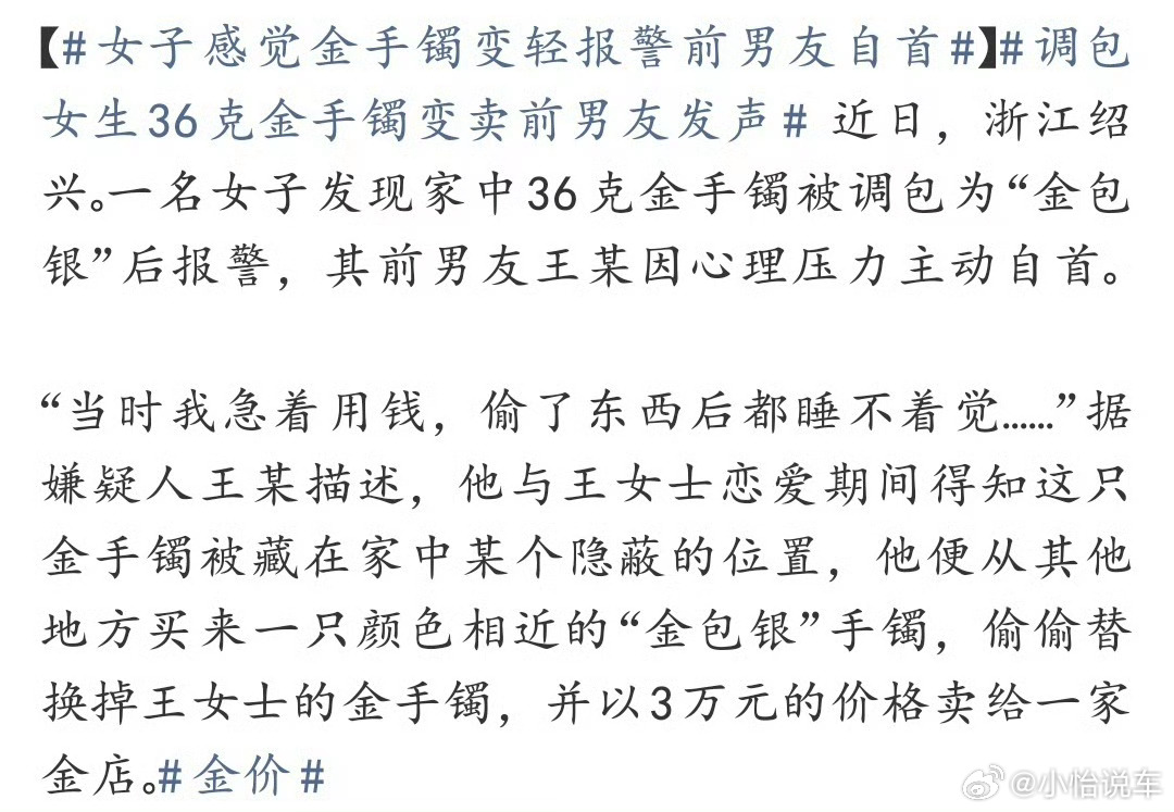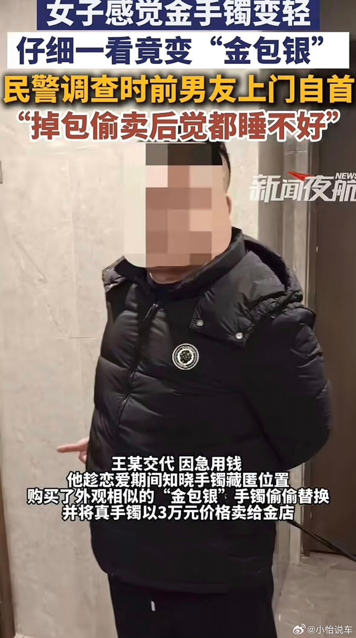 女子感觉金手镯变轻报警前男友自首金手镯变轻,一看前男友调包换成假货,卖掉真金换钱。最后自己心虚自首,又坏又怂,简直离谱