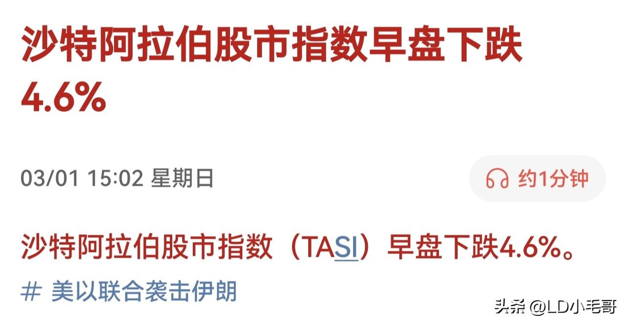 美伊战争后第一个开盘的股市出现了,暴跌! 【沙特阿拉伯股市指数早盘下跌4.6%】沙特阿拉伯股市指数(TASI)早盘下跌4.6%。 沙特阿拉伯股指暴跌近5个点,这足以说明了中东局势的危险性! 不过我还是看好大A,明天低开高走大有可能。 为什么? 因为中东局势倒有可能倒逼资金来华投资发展,毕竟咱们这里稳定安全,没有这样的地缘冲突。 只要避险资金开始开华,流动性增长,何愁A股不涨? 所以明天A股如果低开,也是机会!