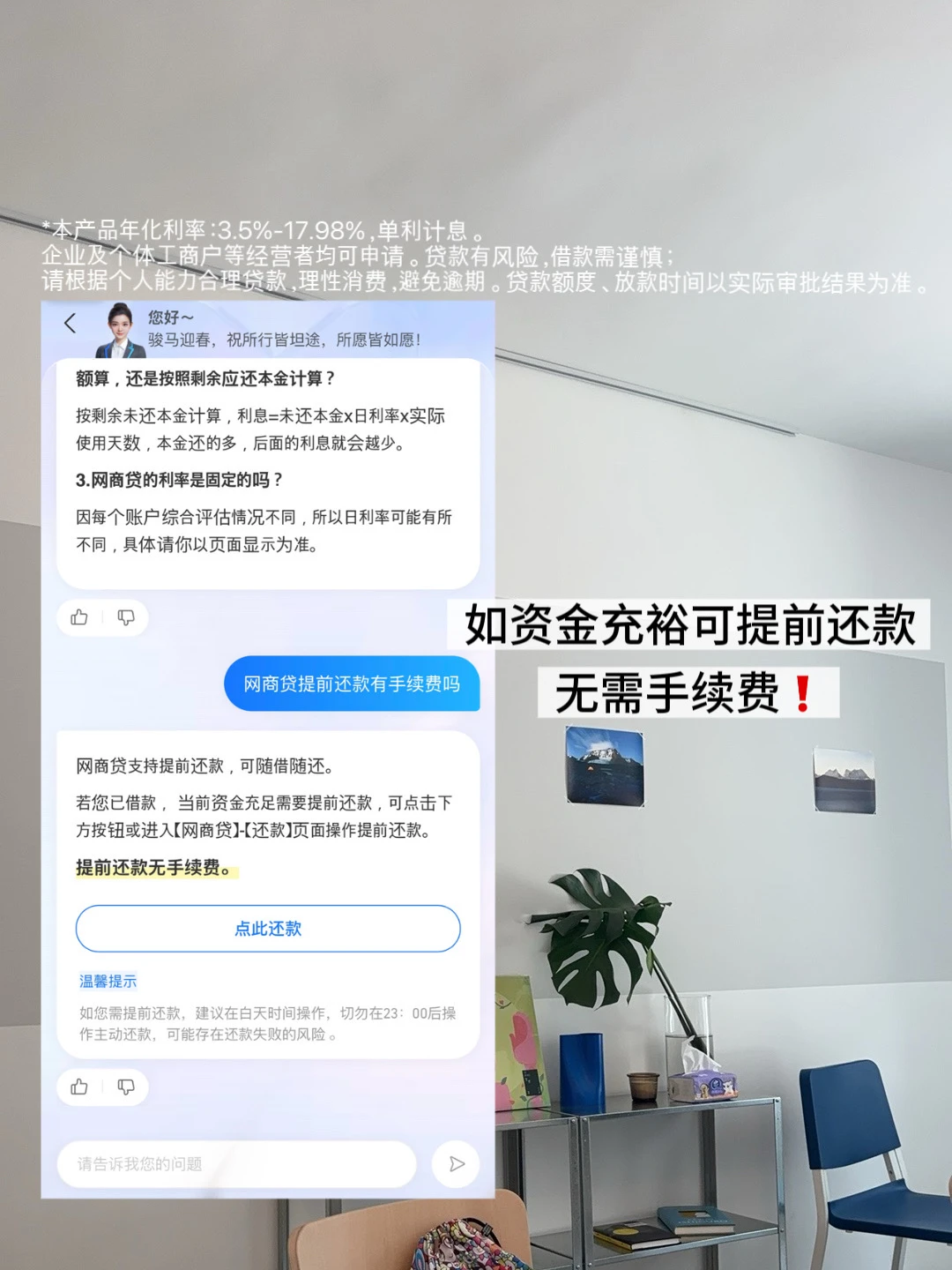 本产品年化利率:3.5%-17.98%,单利计息。企业及个体工商户等经营者均可申请。贷款有风险,借款需谨慎;请根据个人能力合理贷款,理性消费,避免逾期。贷款额度、放款时间以实际审批结果为准。