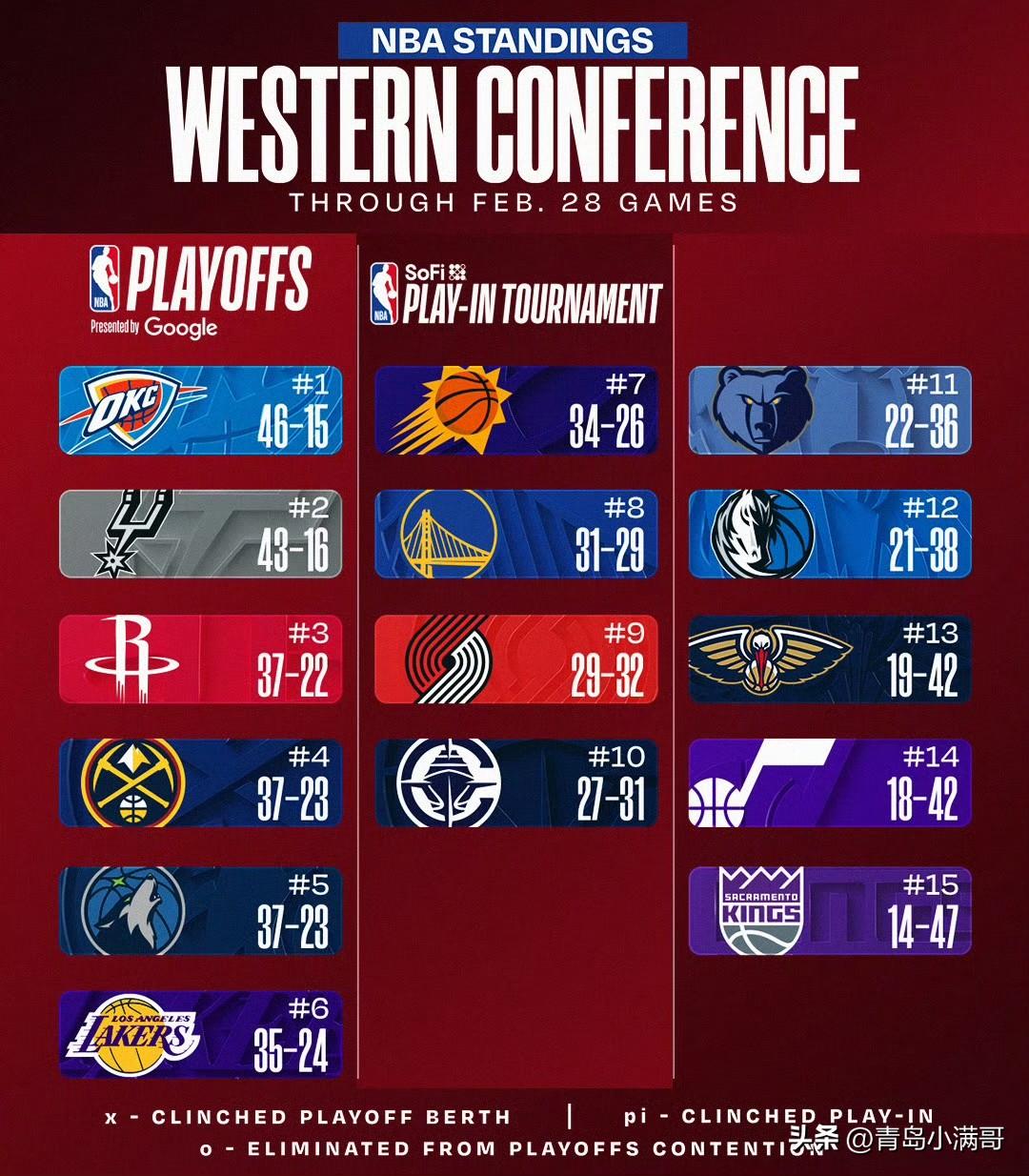 东西部最新战绩排名!!!年底的快乐是卡罗拉给的 北京时间3月1日,今天是周日,一天的比赛结束了,共计五场比赛,东西部球队排名变化不大,一起来看下今日比赛汇总吧! 比赛结果汇总: 开拓者93-109黄蜂; 火箭105-115热火; 猛龙134-125奇才; 湖人129-101勇士; 鹈鹕115-105爵士。 东部方面: 前10名球队中,只有黄蜂和老鹰位置有变化,黄蜂反超老鹰升至第九。 西部方面: 前10名球队中没有任何变化,战绩相对稳定。 赛季已经进行到了后四分之一的赛程,前十名球队的名单基本稳定,接下来就是位置的争夺,附加赛球队能否冲进季后赛就看最后这段时间了。 东部第一的活塞,以及西部第一的雷霆、第二的马刺都坐稳了头部球队,后面的球队想赶超还是有难度的,明天又是一个超级比赛日,相信会有一定的排名变化,加油!湖人 金州勇士