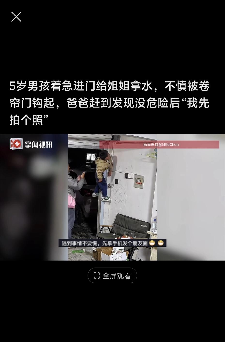 5岁男孩着急进门给姐姐拿水,不慎被卷帘门钩起,爸爸赶到发现没危险后“我先拍个照”。网友:遇到事情不要慌,先拿手机发个朋友圈。 江苏常州的一位爸爸刘先生,前两天在网上发了一段视频,把自己推到了风口浪尖上。 事情发生在他们自家车库。监控视频里拍得清清楚楚,刘先生家5岁的小儿子,着急去车库给姐姐拿水,一溜小跑就往里冲。 结果人刚走到门口,身后的卷帘门正往上升,这孩子运气也“好”,衣服后领子不偏不倚就被门最下面的那条横杠给钩住了。 孩子瞬间就被带离了地面,两只脚在那乱蹬,整个身子悬在半空中晃荡,孩子吓得哇哇大叫。那场面,说实话谁家大人看了都得心揪一下。 刘先生在屋里听到动静,赶紧跑出来。他跑到车库门口,抬头看了一眼挂在门上的儿子。按常理说,当爹的肯定得一个箭步冲上去,先把孩子抱下来再说。可刘先生接下来的操作,让所有人都愣住了。 他没有急着救人,而是往后退了小半步,从上衣口袋里掏出手机,打开相机,对准挂在半空中的儿子,拍了一张照片。 拍完照,他才不慌不忙地走上前,把孩子从门上抱了下来 。 事后刘先生把这段监控发到网上,还配文解释了一下。他说当时卷帘门有自动限位功能,孩子挂在那不会再往上升了,而且他观察了,孩子虽然吓得不轻,但确实没受伤。 之所以先拍照,是想记录下这个“名场面”,让孩子长长记性。他还说,经过这么一吓,孩子现在每次走到车库门口,都会先停下来左右看看,再也不敢冒冒失失往里冲了 。 事情传到网上后,有的网友直接开涮:“这绝对是亲爹,只有亲爹才能干出这事儿,后爹都没这闲心。” 还有网友调侃:“父亲带娃,活着就好。这娃心理阴影面积得有多大,估计这辈子都忘不了他爹站在底下拍照的那个画面。” 也有网友表示理解不了:孩子吓得嗷嗷叫,当爹的第一反应不是抱下来安慰,而是拍照? 更有网友一针见血:“你知道没危险,可孩子不知道啊。那一刻孩子得多害怕,他需要的是爸爸的拥抱,不是镜头。” 当然也有站刘先生的:“我觉得没啥问题,这种爹心态好,养出来的孩子皮实。总比那些孩子摔一跤,全家三代人围过来又哭又闹的强。” 对此,你们怎么看?