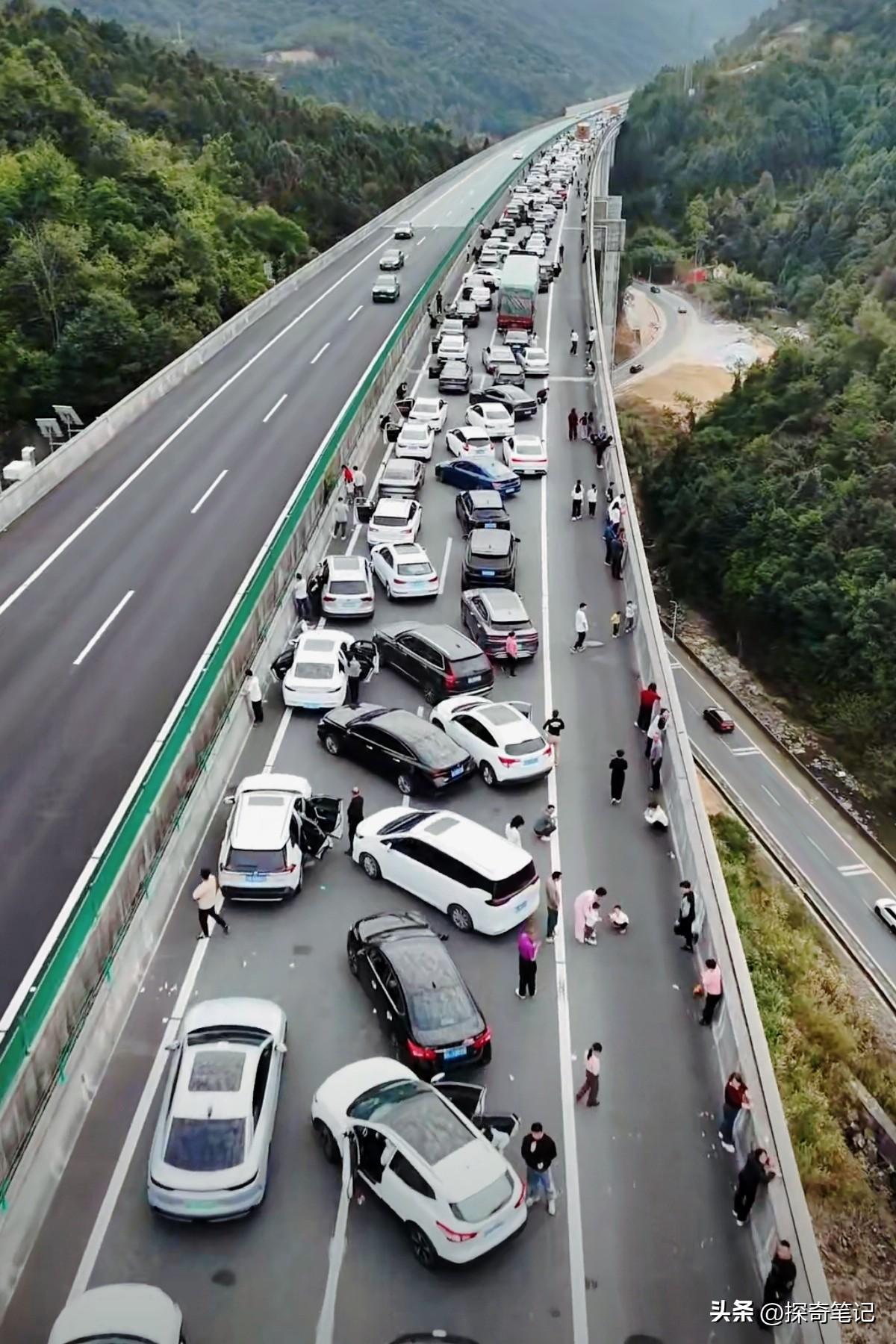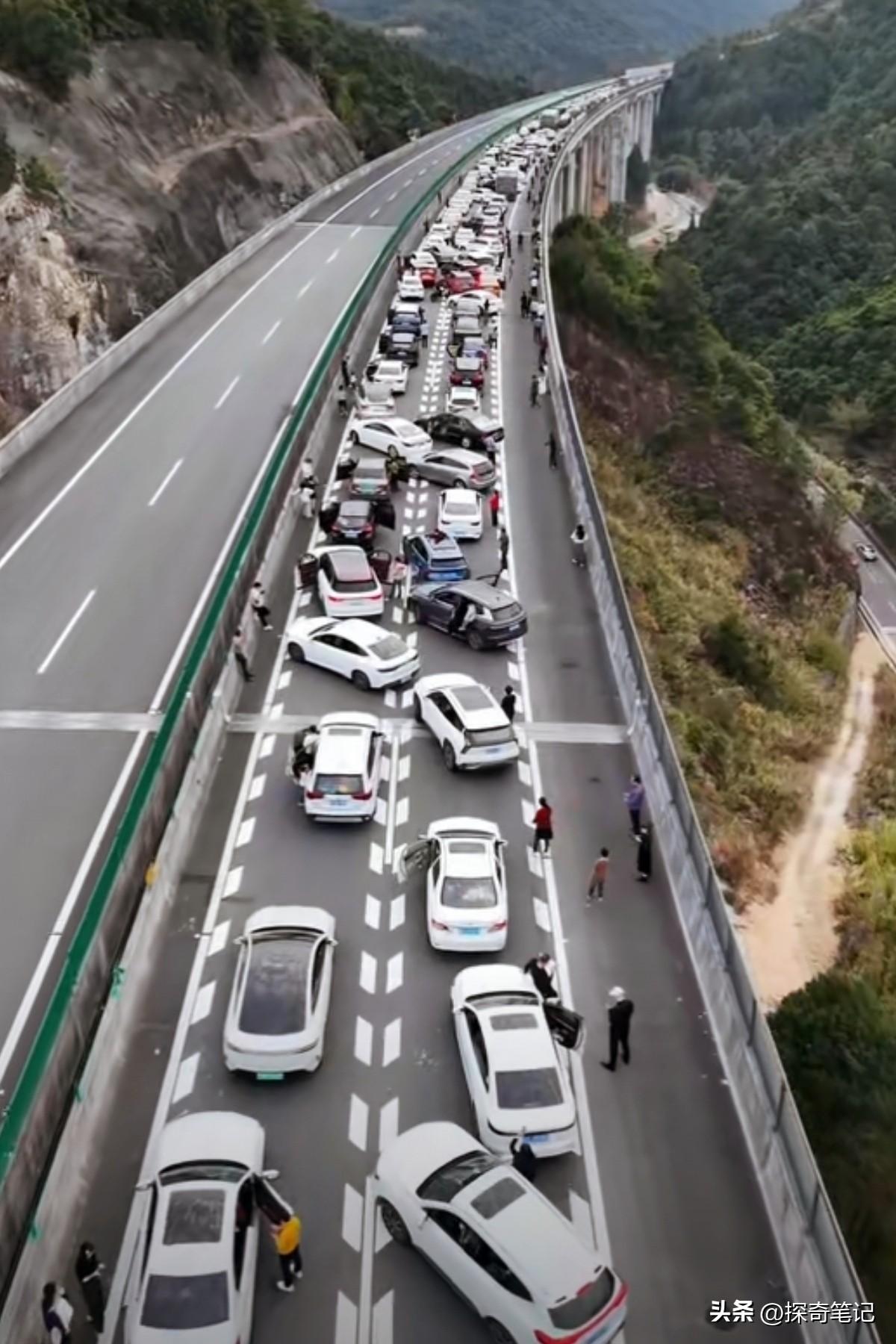 这是什么情况?一边堵死了,一边松死了。这要是独柱桥的话,那还了得! 这里令人不解的是,这么多车为什么都是斜着停呢?