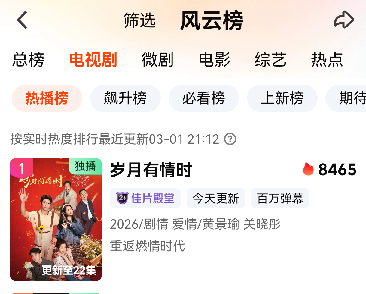 《岁月有情时》今晚第一次在站内热度登顶,涨幅喜人!大家一起庆祝张小满回家!黄景瑜张小满