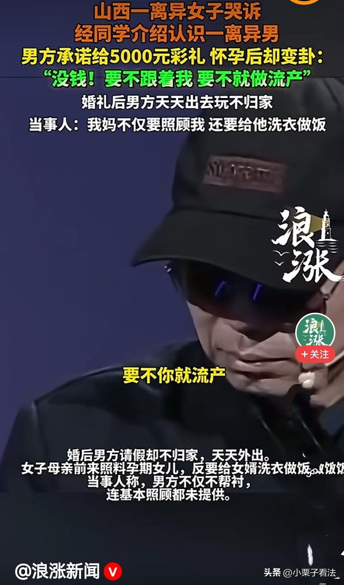 “咋不长记性呢!”山西,一离异女子经同学介绍认识一离异男,男方承诺给5000元彩礼,女子很快与男子同居,她告诉男子自己是易孕体质,男子说:没事,我负责!谁知,女子怀孕后,男子说没钱,要不就这样跟着他,要不就做流产。女子找到男方家中,由亲戚垫付了5000元两人才办了婚礼。婚后男子天天出去玩儿不归家!女子崩溃哭诉:我妈不仅要照顾我,还要给他洗衣做饭!他不仅不帮衬,连基本的照顾都未提供。网友:现在知道前夫好了吧? 近日,山西一位离异女子的哭诉让不少网友看得心疼,本以为经历过一次失败婚姻后,能遇到真心待自己的人,安稳度过余生。 可没想到,这场经同学介绍的再婚,竟让她陷入了更深的绝望。 女子此前已经历过一段不幸的婚姻,满心期待能开启新的生活,在同学的热心介绍下,她认识了同样离异的男方。 初次见面时,两人相谈甚欢,男方表现得体贴又靠谱,让长期缺乏安全感的她渐渐放下了防备。 谈婚论嫁阶段,女子没有漫天要价,只是提出了5000元彩礼,这笔钱少得几乎可以忽略不计,仅仅是想要一份最基本的仪式感和诚意。 男方当场满口答应,承诺一定会兑现,这让女子更加坚信,自己这次终于选对了人。 相处期间,女子坦诚告知对方,自己是易孕体质,很容易意外怀孕,本想让对方多一份责任与担当。 男方却拍着胸脯保证:没事儿,你放心,真怀了我肯定负责到底!这句承诺,成了女子安心托付的全部底气。 不久后女子果真怀孕,正当她满心欢喜准备迎接新生命时,开启新的生活时,男方的态度却来了个180度大转弯,之前的承诺全都抛到了九霄云外。 他直接摊牌说自己没钱,别说彩礼和婚礼,连基本的责任都不想承担。 他甚至冷漠地丢下两个让人心寒的选择:要么没名没分跟着他,要么直接去做流产。 听到这番话,女子如坠冰窟,满心的期待瞬间化为泡影,她怎么也想不通,婚前信誓旦旦的人,怎么会在自己怀孕后变得如此绝情。 无助又委屈的她,只能找到男方家里讨要说法,最终还是男方父亲家的长辈看不下去,自掏腰包垫付了这5000元彩礼,两人才勉强补办了婚礼。 女子以为,办了婚礼有了名分,日子就会慢慢好起来,可婚后的生活,比她想象中还要糟糕。 男方不仅没有收敛,反而变本加厉,常常找借口请假外出,整天在外游玩,整夜不归家成了常态。 女子怀着孕身体本就不适,情绪也格外敏感,根本无人照料。 心疼女儿的母亲只能放下家里的事,专程赶来照顾孕期中的她,可让人气愤的是,母亲不仅要悉心伺候怀孕的女儿,还要包揽家里所有家务,给游手好闲的女婿洗衣、做饭。 而身为丈夫和未来父亲的男方,对孕期的妻子不管不问,没有一句关心,没有一次陪伴,连最基本的生活帮衬都做不到,仿佛妻子怀孕、家庭琐事,都与他毫无关系。 女子无数次在深夜崩溃落泪,她不明白,自己不过是想要一个安稳的家,一份简单的幸福,为何会如此艰难。 当初的5000元彩礼,不是贪图钱财,只是想要一份最起码的尊重;男方那句“我负责”,不是随口的承诺,而是她托付终身的希望。 可到头来,所有的真心都被辜负,所有的期待都成了笑话。 这场看似简单的再婚,从承诺到翻脸,从期待到绝望,让女子尝尽了委屈与无奈,女子不知她的未来将怎么面对! 有人说,都离过一次了,还这么草率的再婚!这个女人在上一段婚姻里离婚是她的原因,没有吸取教训,太随意了。 有人说,骗婚男骗女人的身体子宫,事后又玩消失不负责任,请问国家应该出什么法律对付这种男人?打击高彩礼是为了防骗婚女,那打击什么可以防骗婚男呢? 还有人说,生下孩子和他离婚,索要抚养费!不给就起诉他! 如他是无赖的话就离得远远的,老死不相往来!这样的男的不如不嫁!自己挣钱,照顾好自己不香吗,非要照顾他人!愿意当免费保姆啊!脑子被门挤了! 更有人调侃:新鲜感过后,生活还是一地鸡毛,是不是更怀念前夫的好了? 有些人以为离就能找到更好的,记住别人丢掉的一定是有原因的,一筐卖到最后的水果都是经过多少人千挑万选出来的! 其实,婚姻从来不是一时的甜言蜜语,而是实打实的责任与担当。 尤其是再婚男女,更该懂得珍惜与真诚,一句承诺就该一诺千金,一份感情就该用心守护。 对此您怎么看?