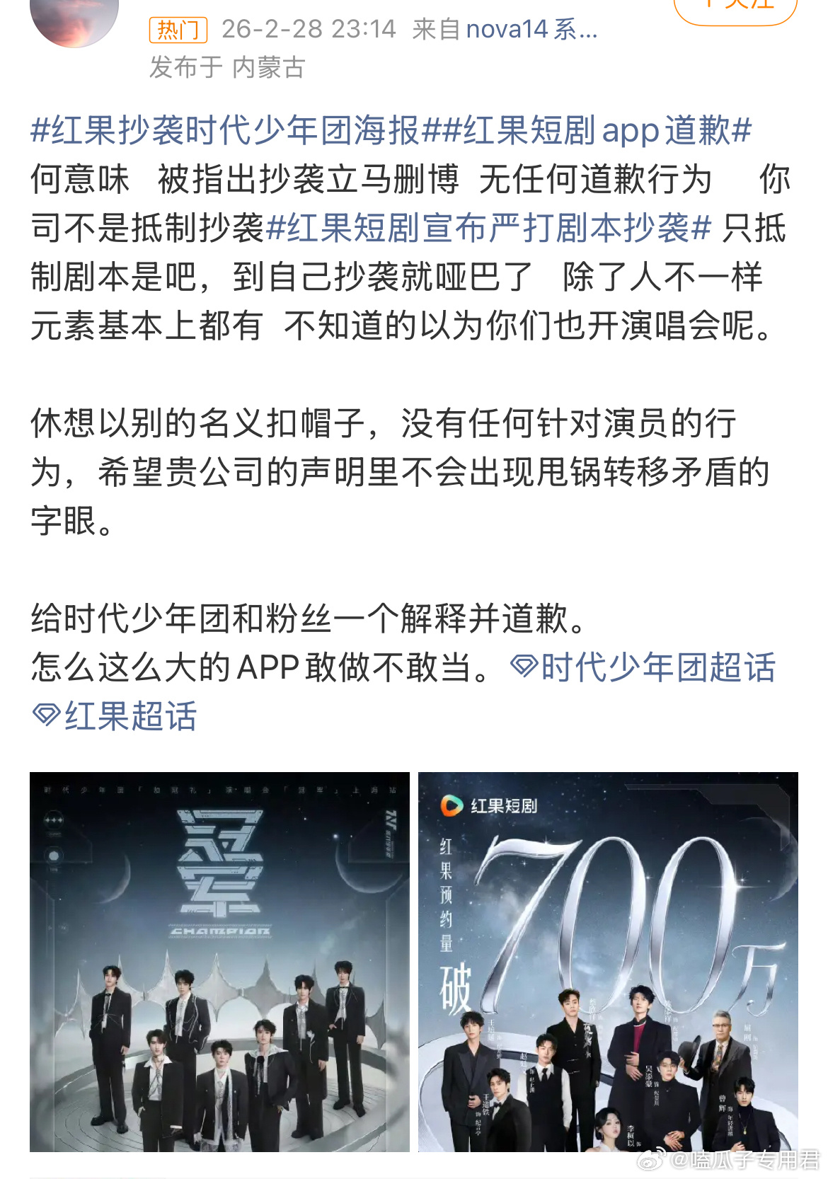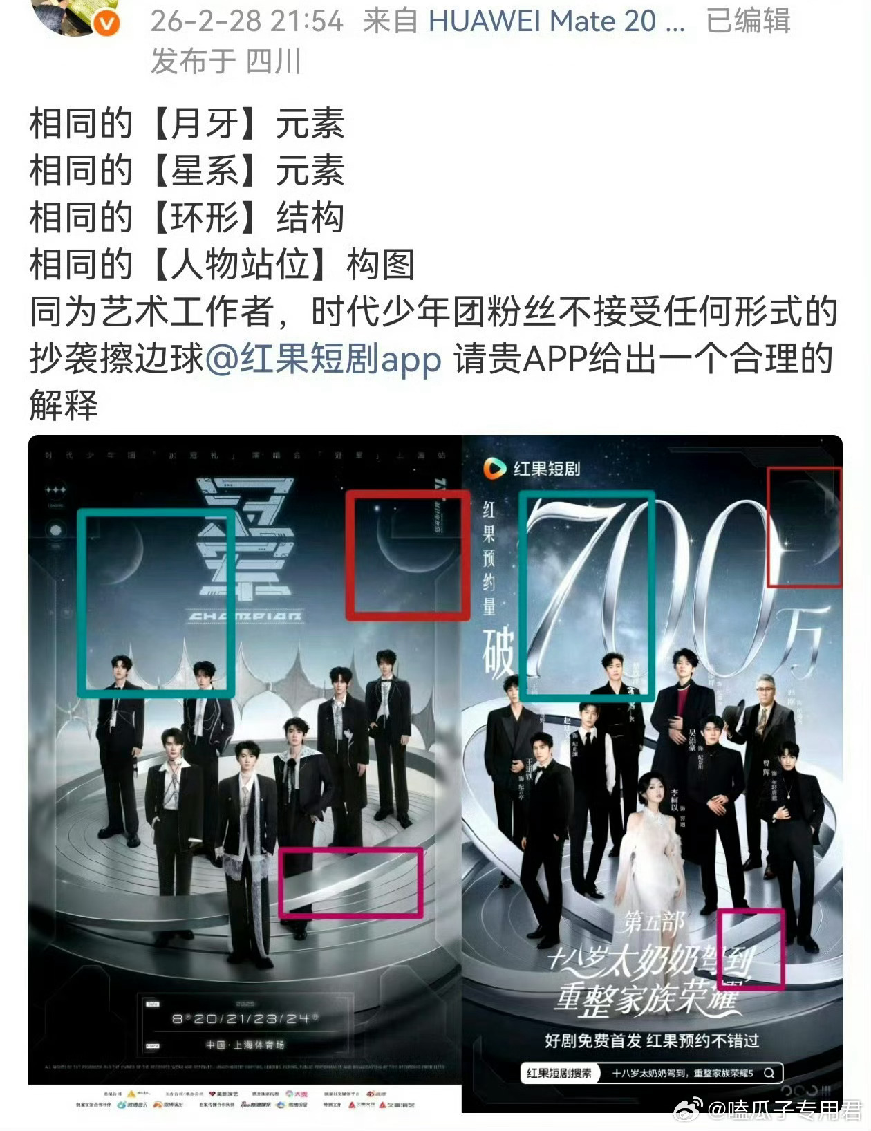 红果短剧APP为短剧《十八岁太奶奶驾到,重整家族荣耀》发布的宣传海报,被指与时代少年团2025年上海“加冠礼”演唱会官宣海报存在多处雷同,引发粉丝大规模维权。另外红果已更新新的海报,并为该行为作出合理解释。