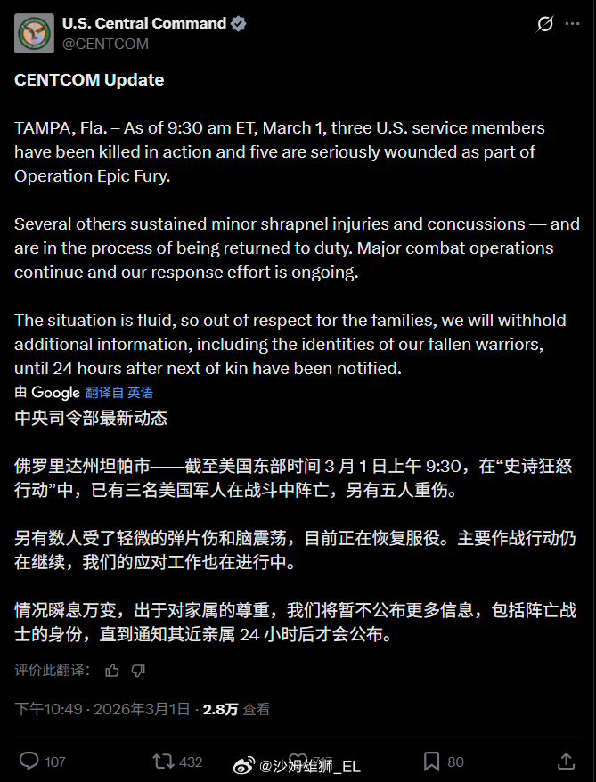 最近:美国中央司令部宣布,美军在伊朗的打击行动中遭受8人伤亡,其中阵亡3人,重伤5人,另有若干士兵受轻伤以及脑震荡。