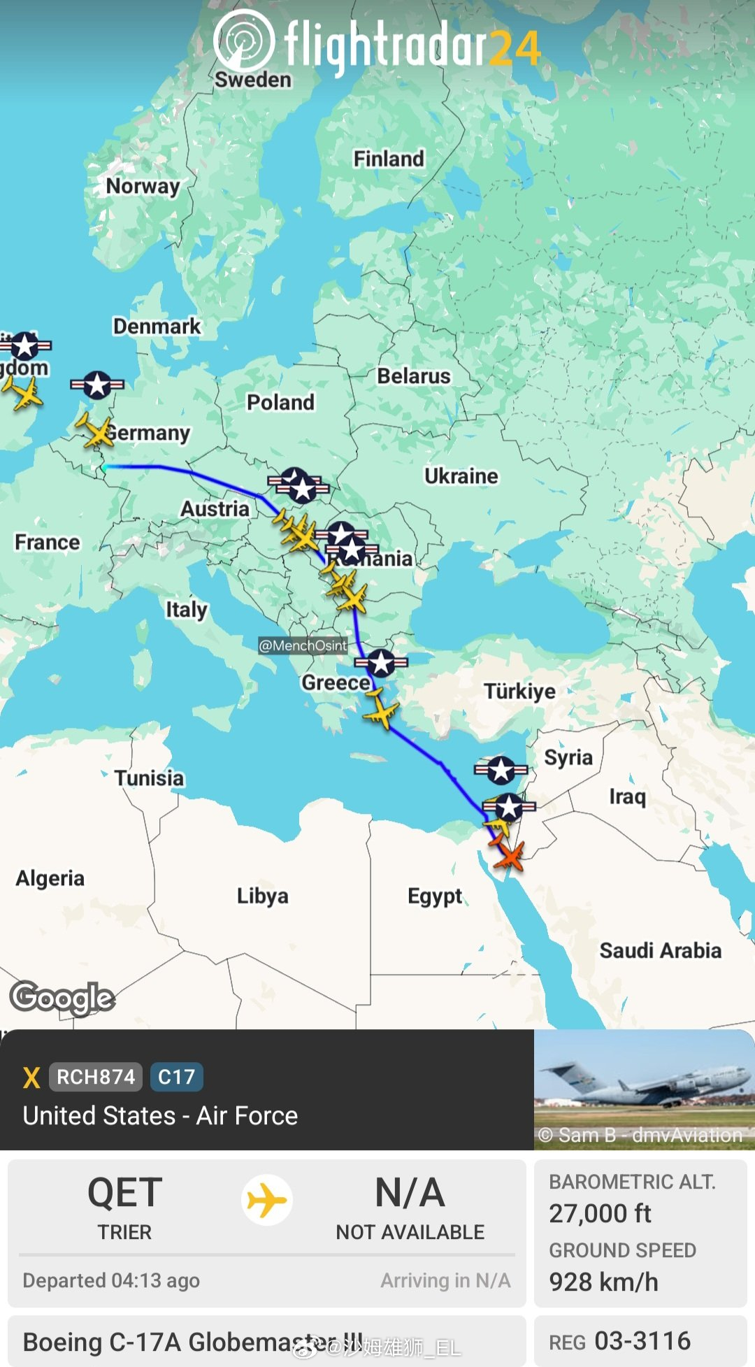 多架美国空军 C-17 运输机正飞往约旦穆瓦法克萨尔蒂空军基地、科威特阿里萨利姆空军基地和以色列奥夫达空军基地。