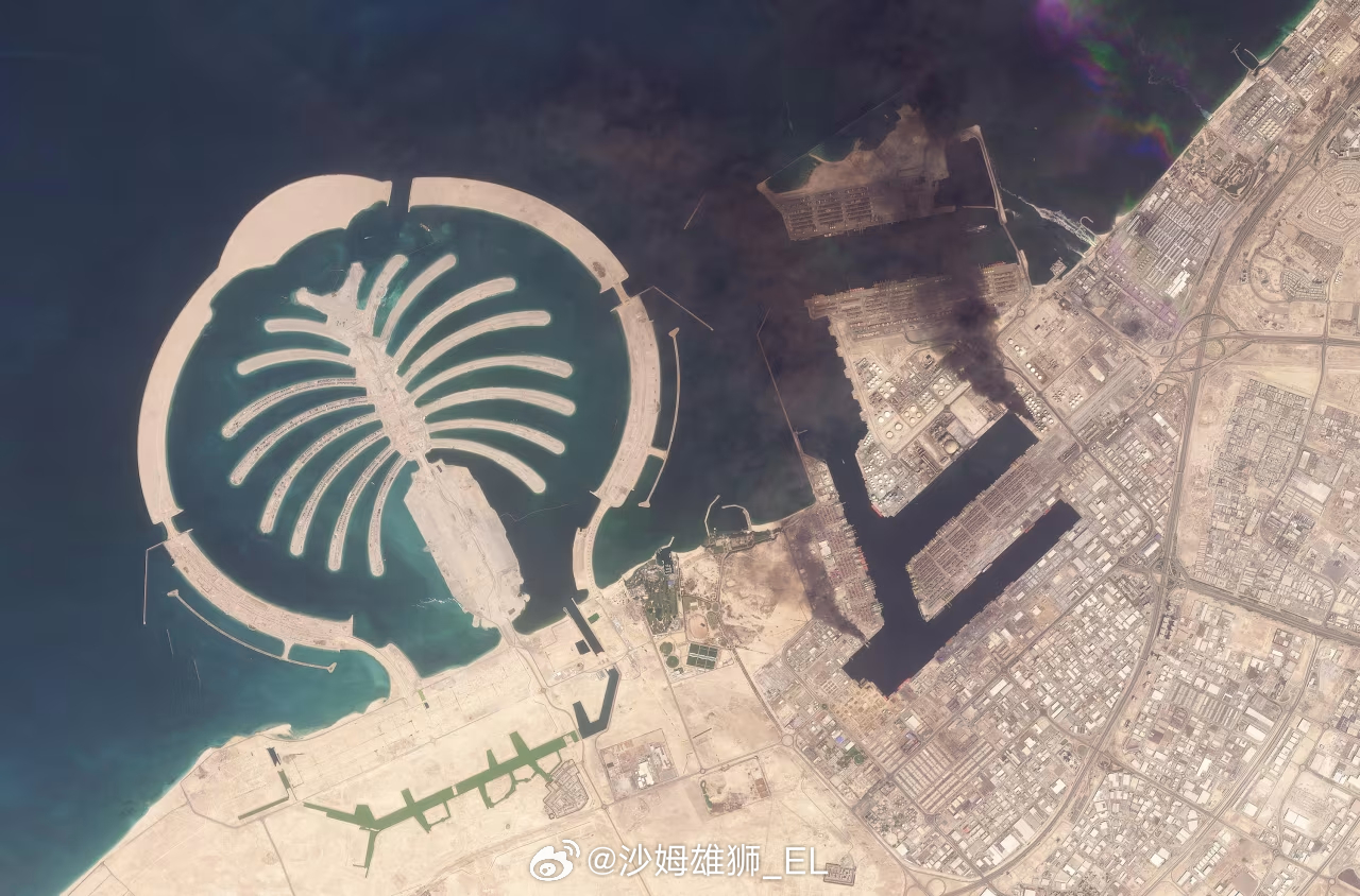 卫星图像显示,迪拜杰贝阿里港冒出滚滚浓烟。