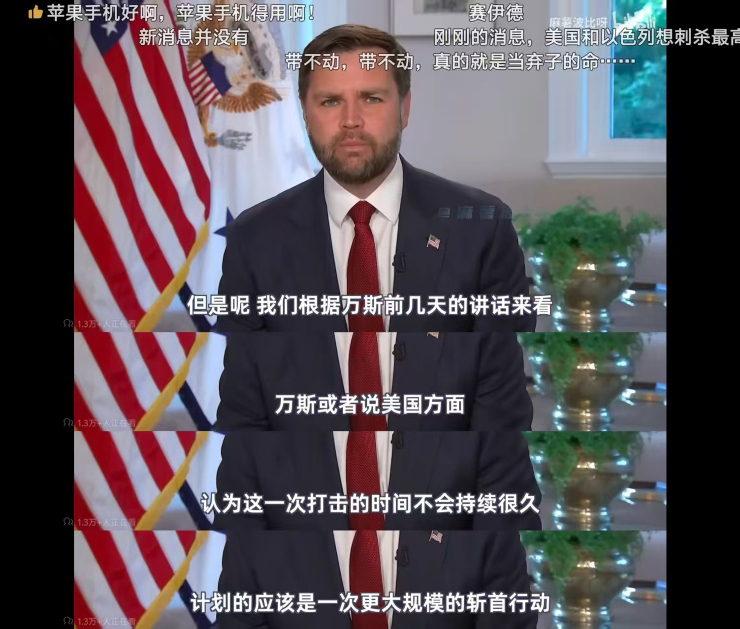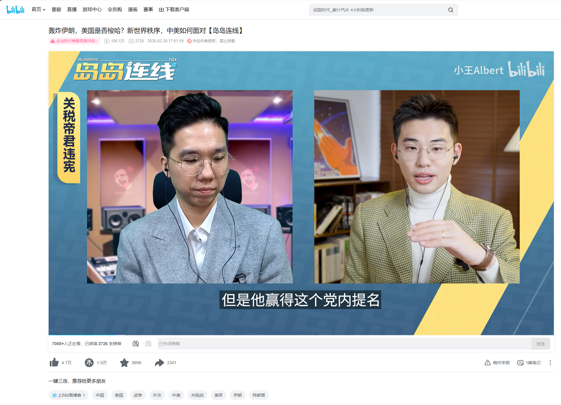 5️⃣杨升Alex的直播切篇:这不是一场直播,这是一场“认知战争”的现场如果说前面四位是“战局分析师”,杨升2月28日的直播就是“战争认知论”的实践者。他做了一件很特别的事:战争打响当天,邀请席亚洲、吴健等三位资深人士连麦,把战争的解读变成多视角实时对话。观众“边刷热搜边追直播”——这个行为本身,就是一种全新的信息接收方式。杨升的直播不是“告诉你发生了什么”,而是“带你一起看发生了什么,以及这意味着什么”。他把全球影响落到油价、航运、地区博弈等可感知层面,让直播成为一场“认知战争”的演练场。在信息时代,战争的解读本身,就是战争的一部分。