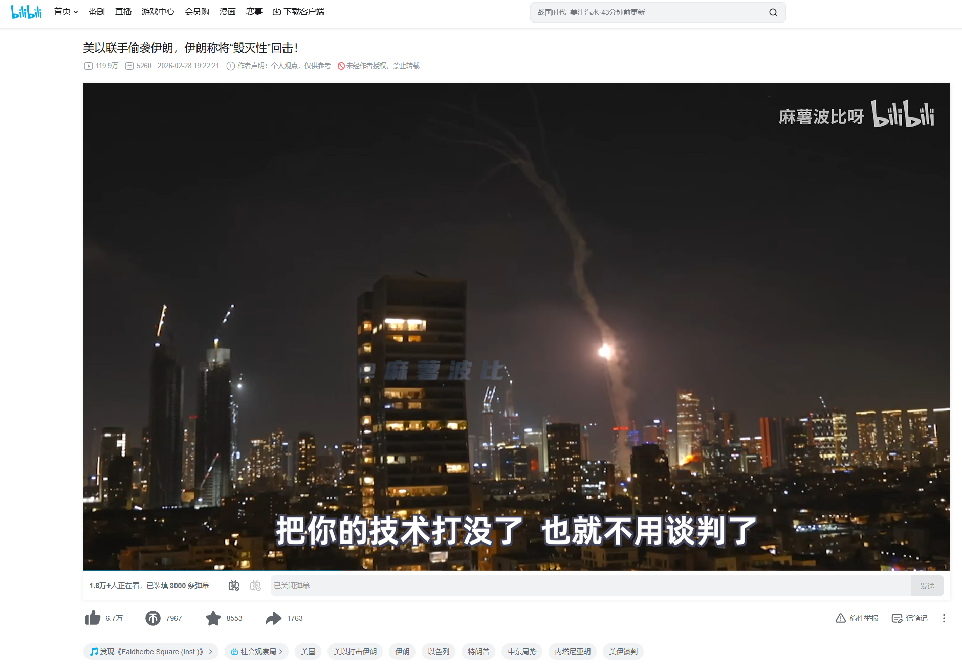 2️⃣ 麻薯波比呀:空袭下的真相:150个孩子没了,但新闻里只有“附带损伤”麻薯波比呀那期,我印象最深的是一个细节——伊朗一所小学被炸,150多个孩子没了。她在视频里详细记录了美以空袭30余个目标的军事细节,但她没有停留于此,而是把镜头对准了那些被“附带损伤”覆盖的普通人。“150个孩子没了,但新闻里只有collateral damage。”这句话,比任何战术分析都扎心。当我们在讨论“政权更迭”时,那150个孩子的父母,在四十天哀悼期里,哀悼的是谁?麻薯波比呀让我们看到:战争的残酷,不在于改变了多少版图,而在于碾碎了多少普通人的生活。