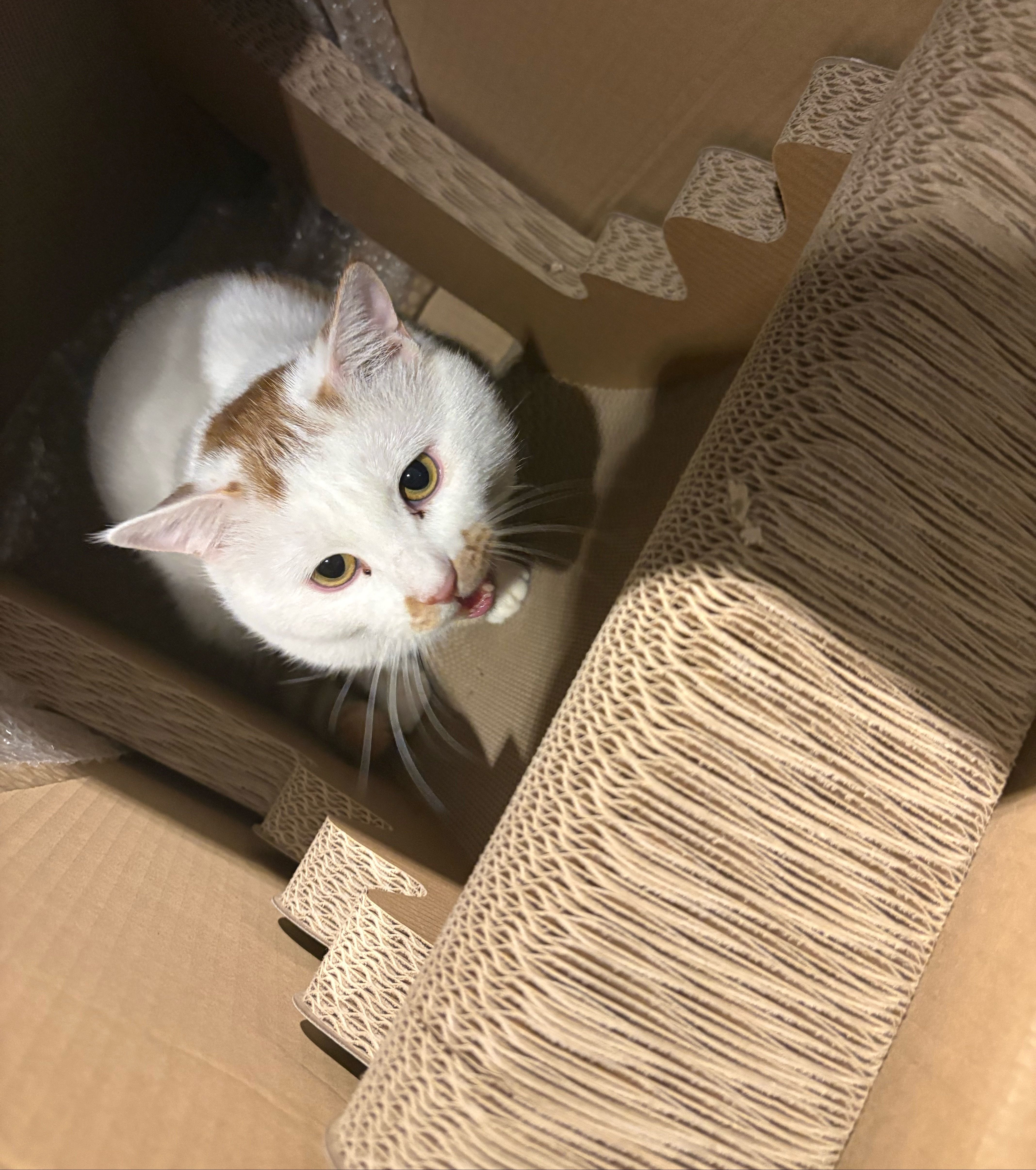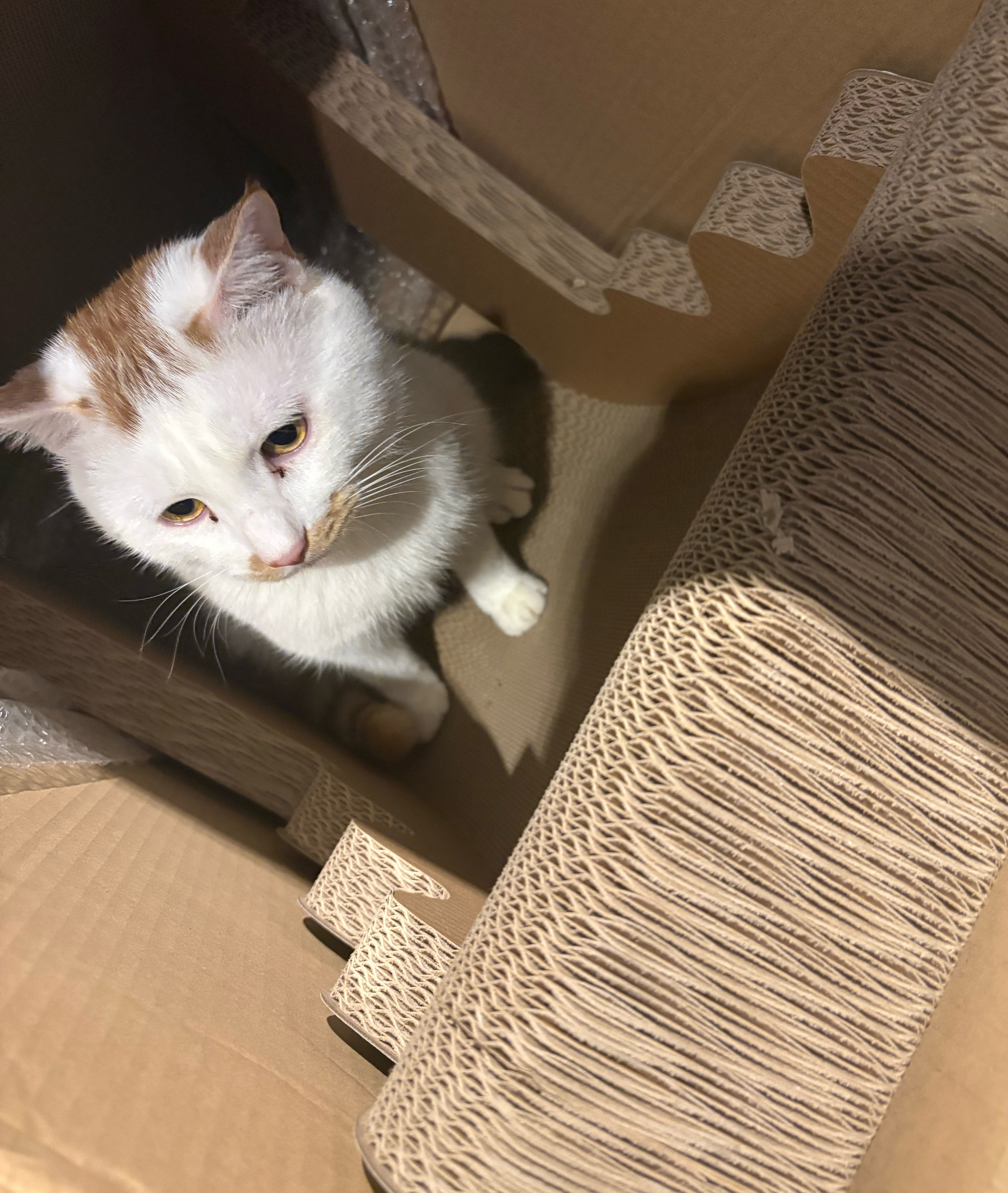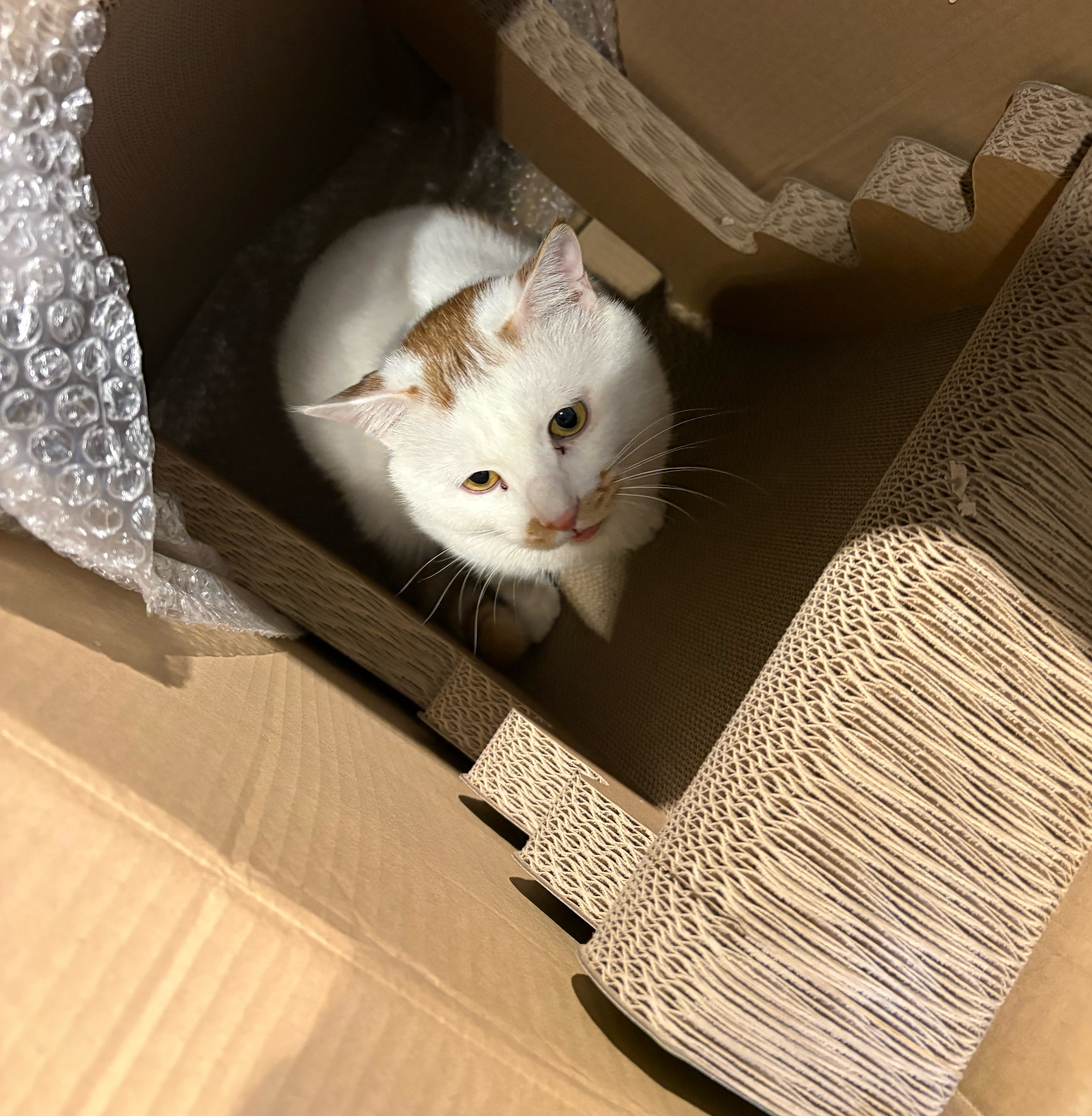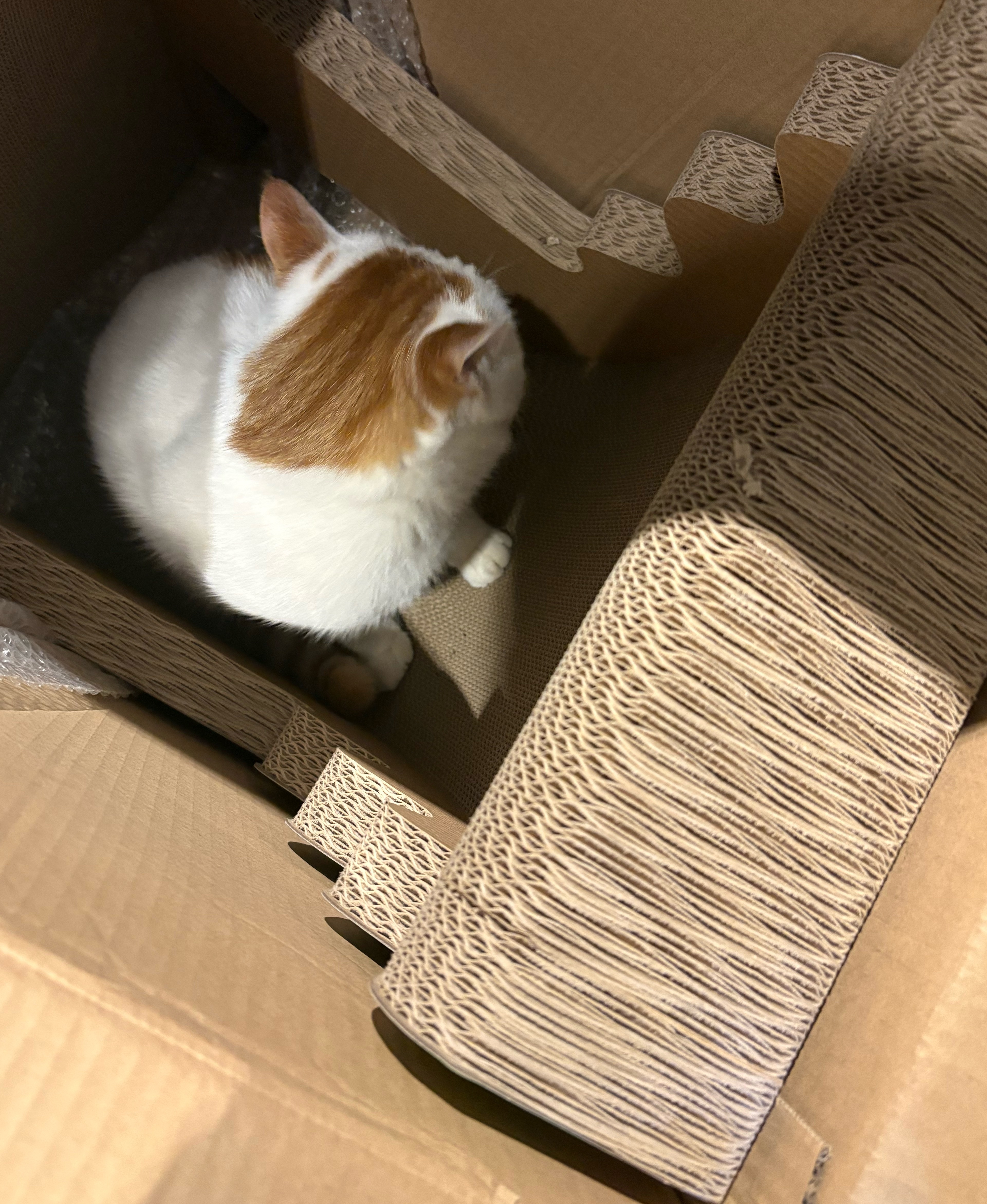 麦子和雪球 买了新猫抓板椰子树,还没拿出来,麦子这个好奇猫已经进去箱子里探索了。