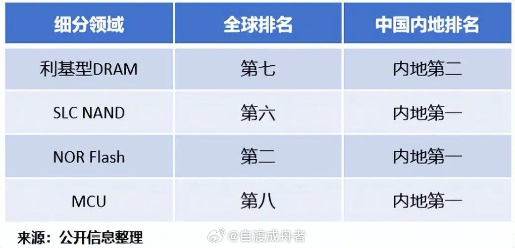 而巨头的转向,给了中国企业机会。三星、美光等头部厂商忙着收缩DDR3、DDR4等利基型DRAM产能,扎堆扑向高端市场,留下的供给空白,成了国产替代的黄金赛道。兆易创新正是抓住了这个窗口,在利基型DRAM、SLC NAND、NOR Flash、MCU四大细分领域均杀入全球前十,其中利基型DRAM全球第七(中国内地第二),SLC NAND全球第六(中国内地第一),硬生生在海外巨头的夹缝里挤出了一片天地。