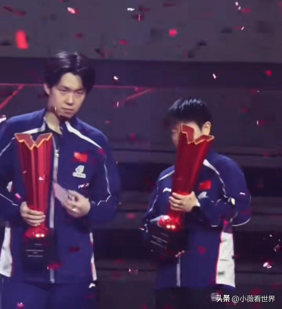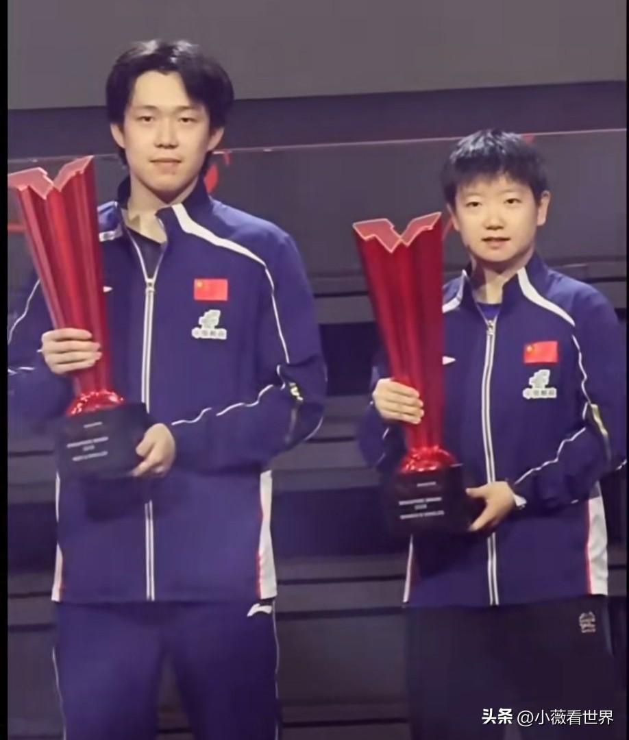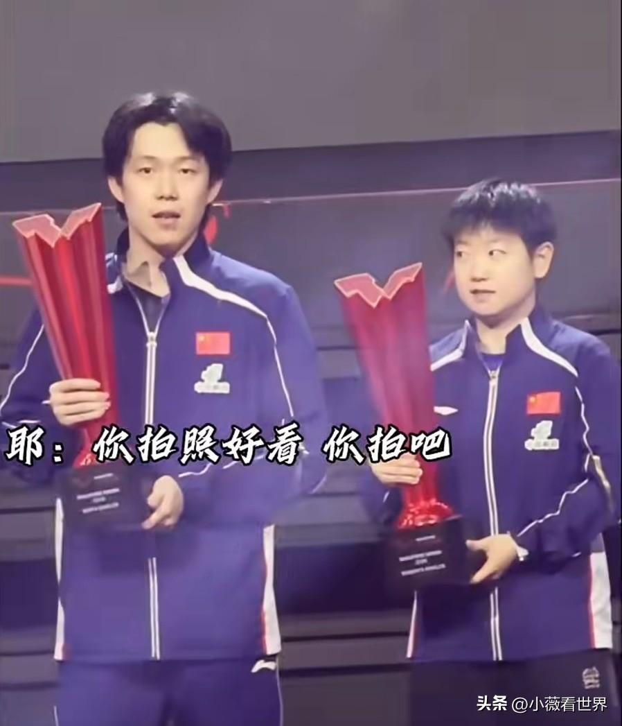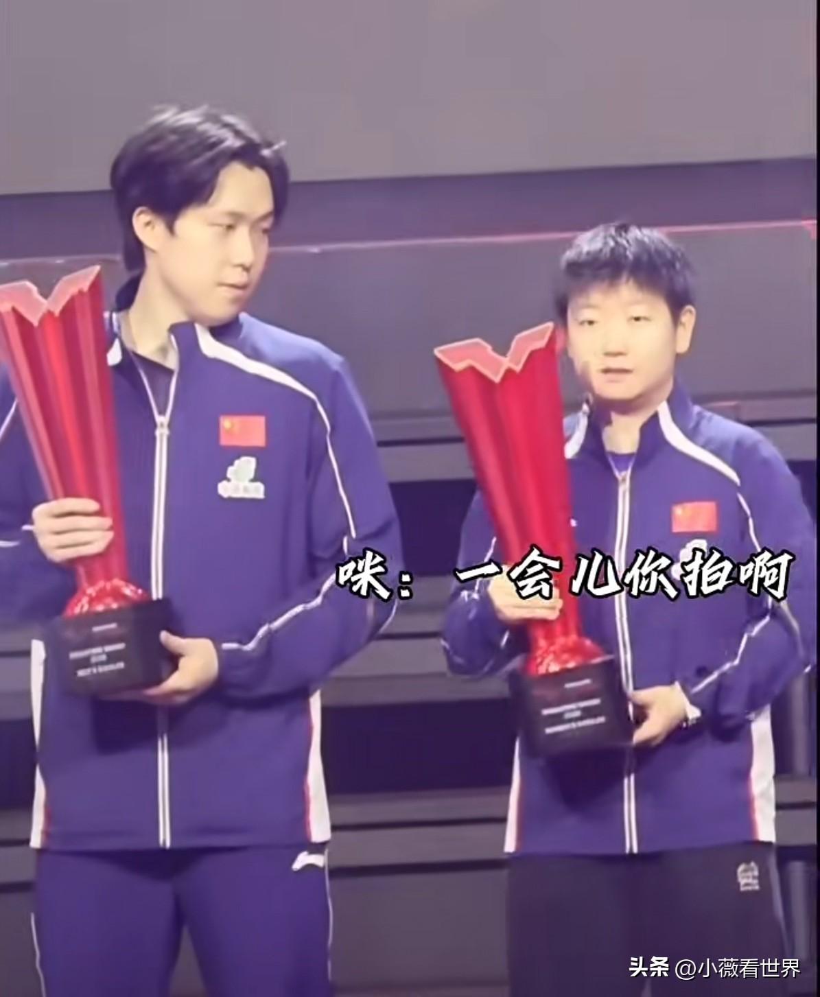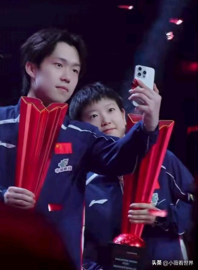 真是笑不活了,新加坡大满贯领奖台上,两小只顶峰相见,这动人的画面里也有小插曲。 当莎莎捧着奖杯来到楚钦旁边,两个人开始交流起来。然后万能的网友根据唇语很快破译—— 莎莎说,一会儿(冠军照)你拍啊!但头哥说,你拍照好看,你拍吧! 这时莎莎一个白眼,凶巴巴地说,让你拍就拍!头哥只好紧跟上回答,拍! 哈哈哈,笑死,一声"拍"是楚钦最后的倔强。让人忍不住想起莎莎喊鼓掌的事,当时他们在看比赛,头哥一边看莎莎,一边赶紧大声喊,鼓。 一看就是关系很好的,已经到了不分你我的阶段!喜欢莎莎在楚钦后面,小小的女孩子漂漂亮亮可可爱爱,执头成功,太招人喜欢啦! 一路同行,终在顶峰相见,恭喜王楚钦,恭喜孙颖莎,恭喜你们双双夺冠!未来继续发光彼此照亮! 合则天下无双,分则各自为王。少年并肩,荣耀加冕,以热爱赴巅峰,为国乒续写传奇。莎莎楚钦,你们太棒啦!为你们骄傲!