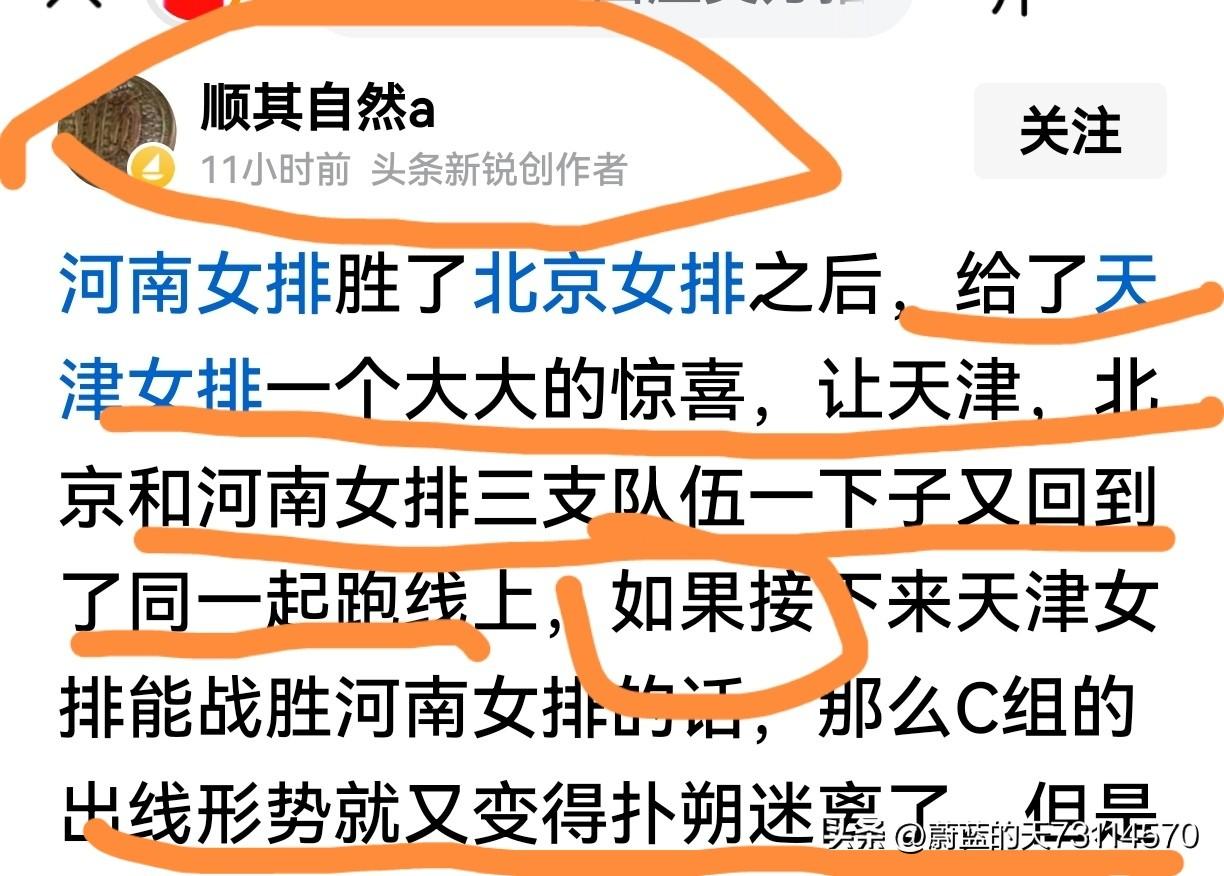 [智商堪忧,不识时务,喜从何来?] 津迷“顺其自然a”喜言:“河南女排胜了北京女排之后, 给了天津女排一个大大的惊喜”。那么这喜从何来?因为这惊喜“让天津、北京、河南女排一下子又回到了同一起跑线上”“如果接下来的比赛天津女排能够战胜河南女排的话,那么……” 呵了!大大的惊喜?同一起跑线?如果能胜河南?[笑哭][笑哭] 河南胜北京女排,天津女排晋级四强又多了个竞争对手,这对天津女排而言到底是喜是忧?不言自明![笑哭][笑哭] 河南胜北京女排,让天津、北京、河南女排处在同一起跑线上?呵了!河南胜了北京女排后,C组排名:上海2胜积6分排第一,北京1胜1负积3分排第二, 河南1胜1负积2分 排第三,天津女排0胜2负积1分排第四。 这是回到同一起跑线吗?这脑子?[笑哭][笑哭] 如果接下来天津女排能胜河南女排的话,那……唉,叹息!又是如果,津粉的生活始终在如果之中,从而不想结果、后果和无花果。[笑哭][笑哭]