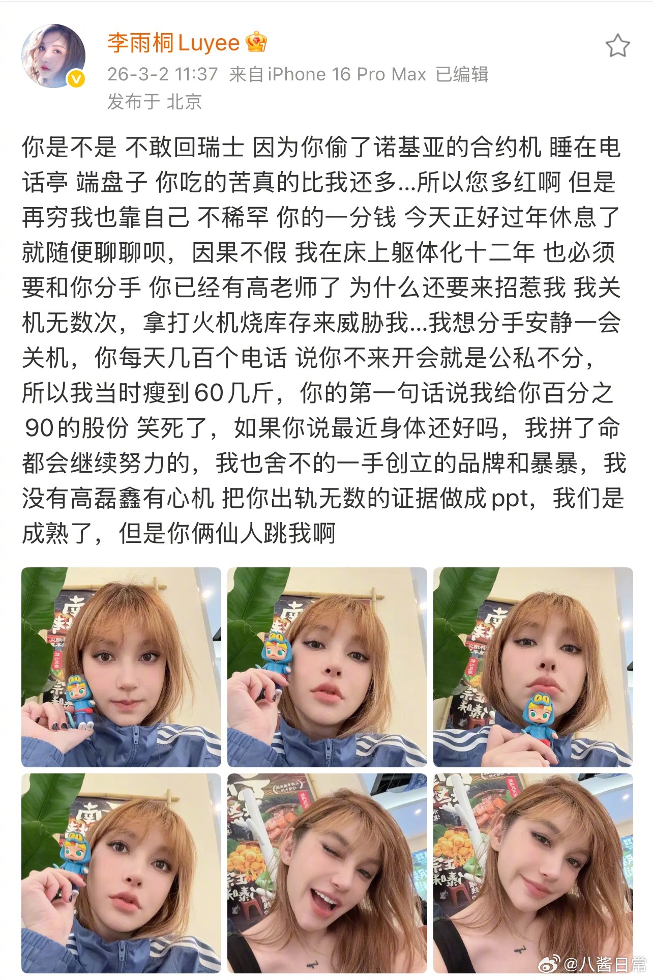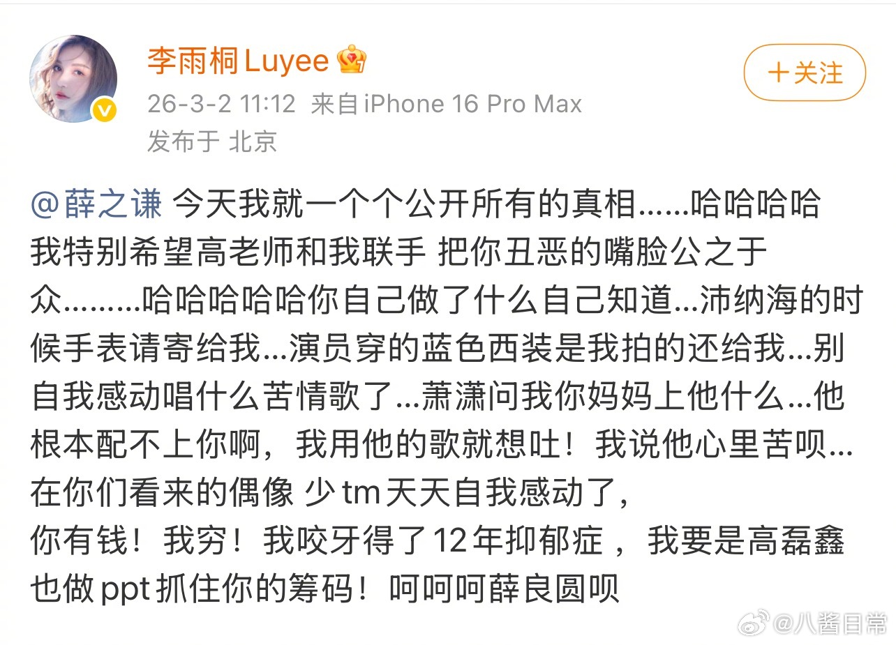 天呐,太抓马了。李雨桐爆料薛之谦有重婚罪,说薛之谦杀了她的孩子,还透露薛之谦说张