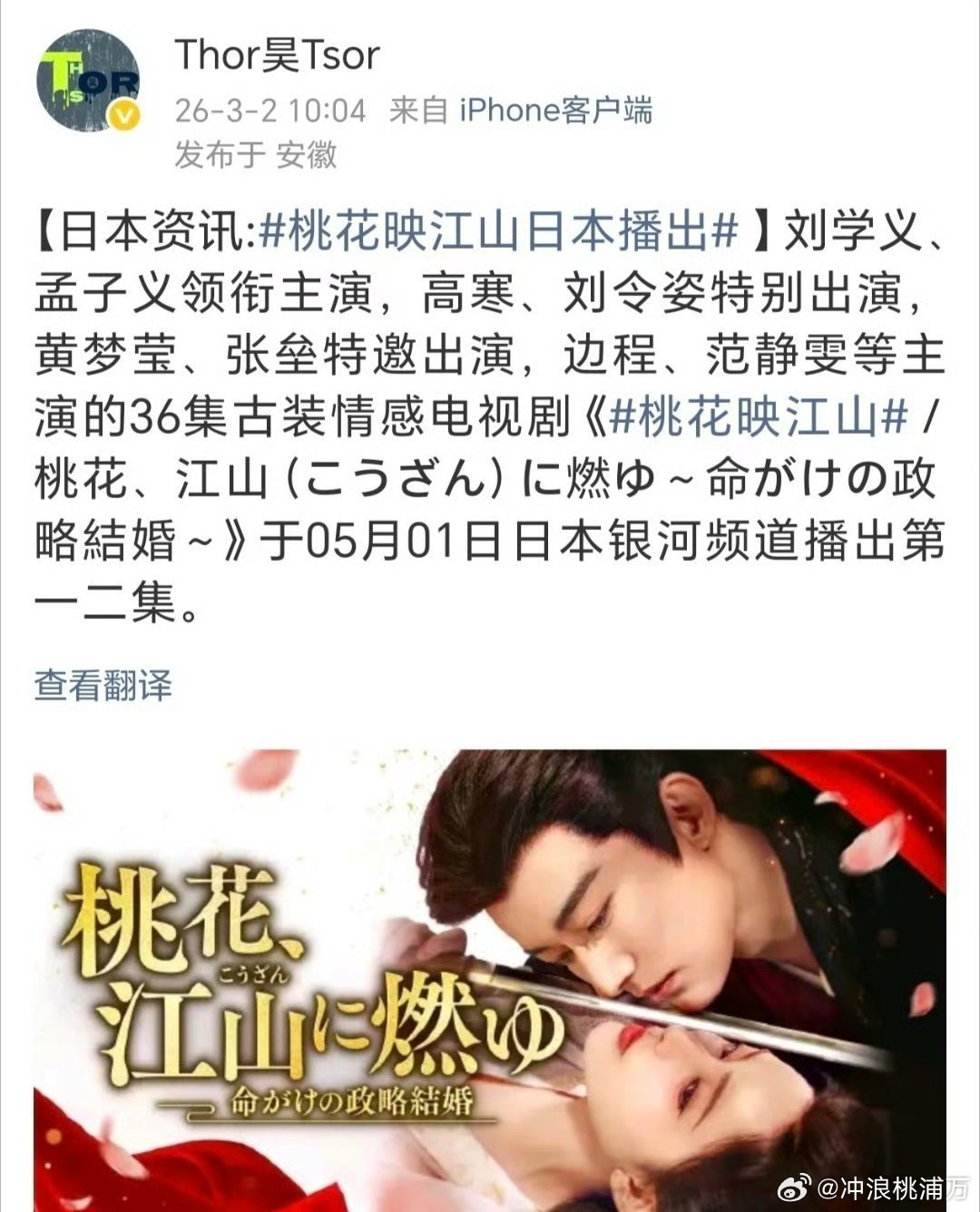 桃花映江山将在日本播出孟子义刘学义《桃花映江山》将在日本播出了!桃花映江山5月日本播出于05月01日日本银河频道播出第一二集~这两人的剧真的不愁卖