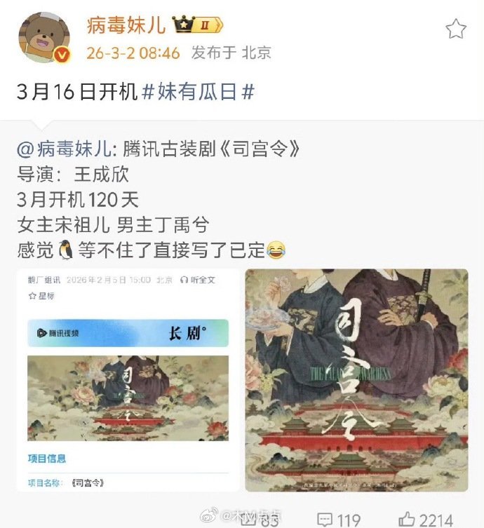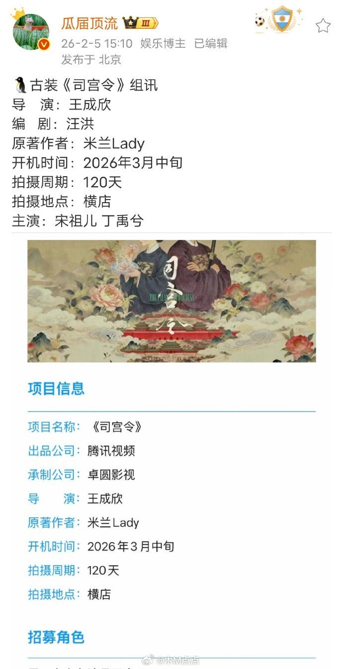妥了如果过会顺利可能是3月围读,流量生+热门花~豆瓣瓜主说丁禹兮宋祖儿《司宫令》3月8号定妆,最晚3月16-18号开机。都要定妆了,就不存在过会失败了吧…司宫令番位、围读、开机时间都出来了,感觉很真啊