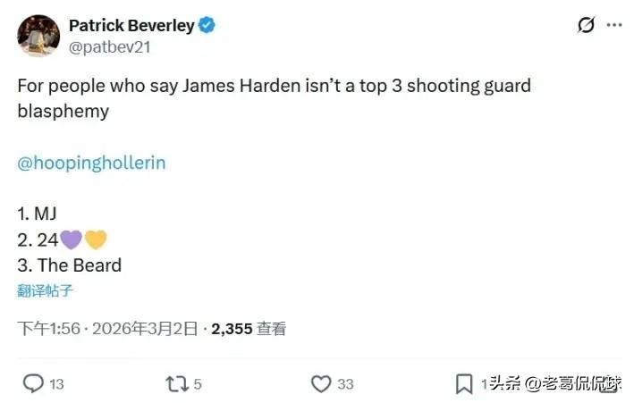 前NBA著名球星贝弗利真是太仗义了!今天贝弗利特意更新社媒支持自己的好兄弟哈登,贝弗利这样写道:“那些讲哈登不是历史前三得分后卫的人纯属亵渎神明,乔丹第一、科比第二、哈登第三!” 贝弗利真是太仗义了,他能够顶住一些舆论压力来支持哈登真是太难能可贵了。说实话,虽然我也觉得哈登不是NBA历史前三的得分后卫,但是我非常欣赏贝弗利的仗义。