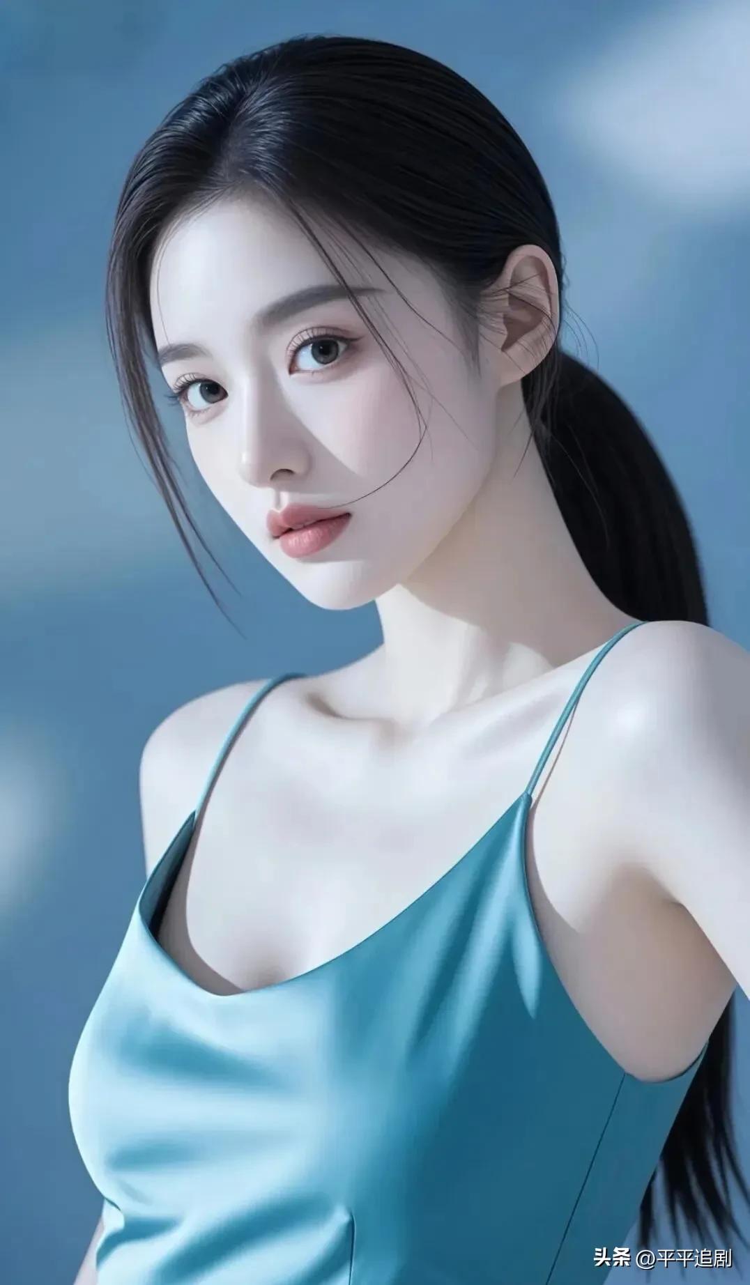 青蓝缎面裹身,青丝高束利落,在柔焦光影里,尽是清冷的高级质感。 东方气质美人