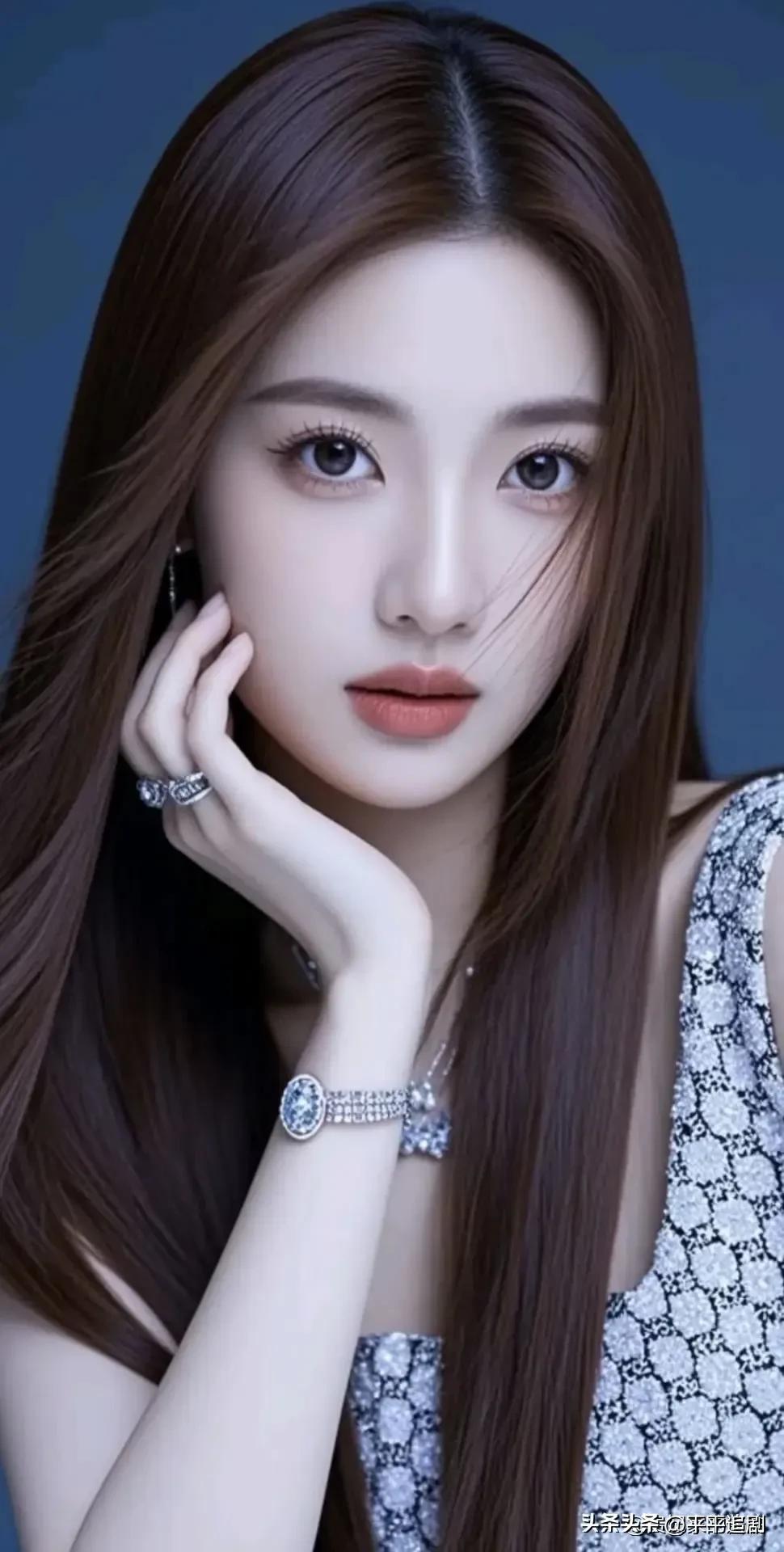 冷调深蓝作底,碎钻华裳缀身,指尖轻托腮边,尽是清冷的高级感。 温婉高级素净之姿