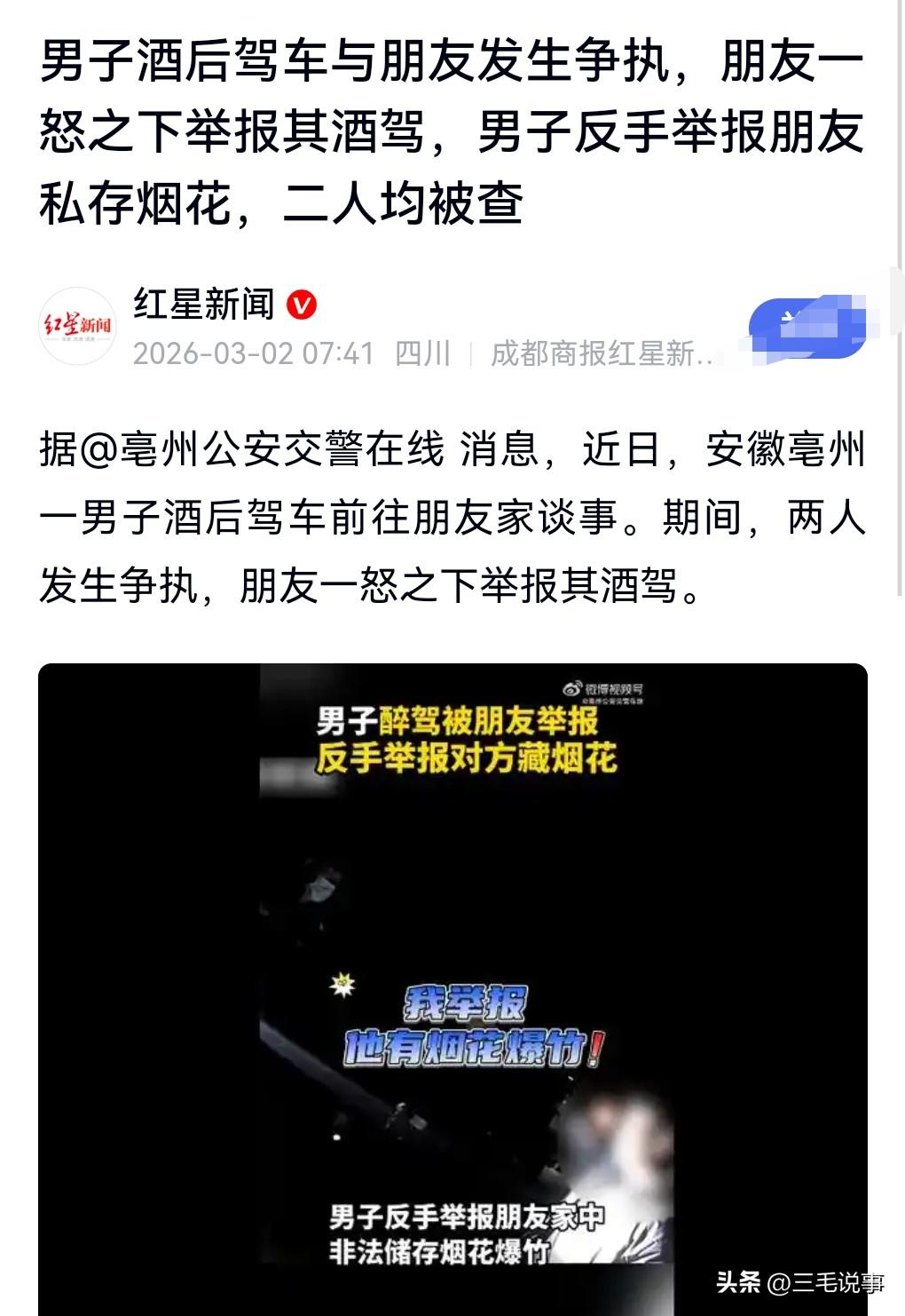这个世上没有永远的朋友。 近日,一男子酒驾开车去朋友家谈事,双方发生争执。 朋友举报男子酒驾,男子反手举报朋友私存烟花。 两人都会被处理。 这下估计朋友做不成了。 这也敲醒了警钟,每个人都要遵纪守法。被举报酒驾后 反手举报朋友私存烟花