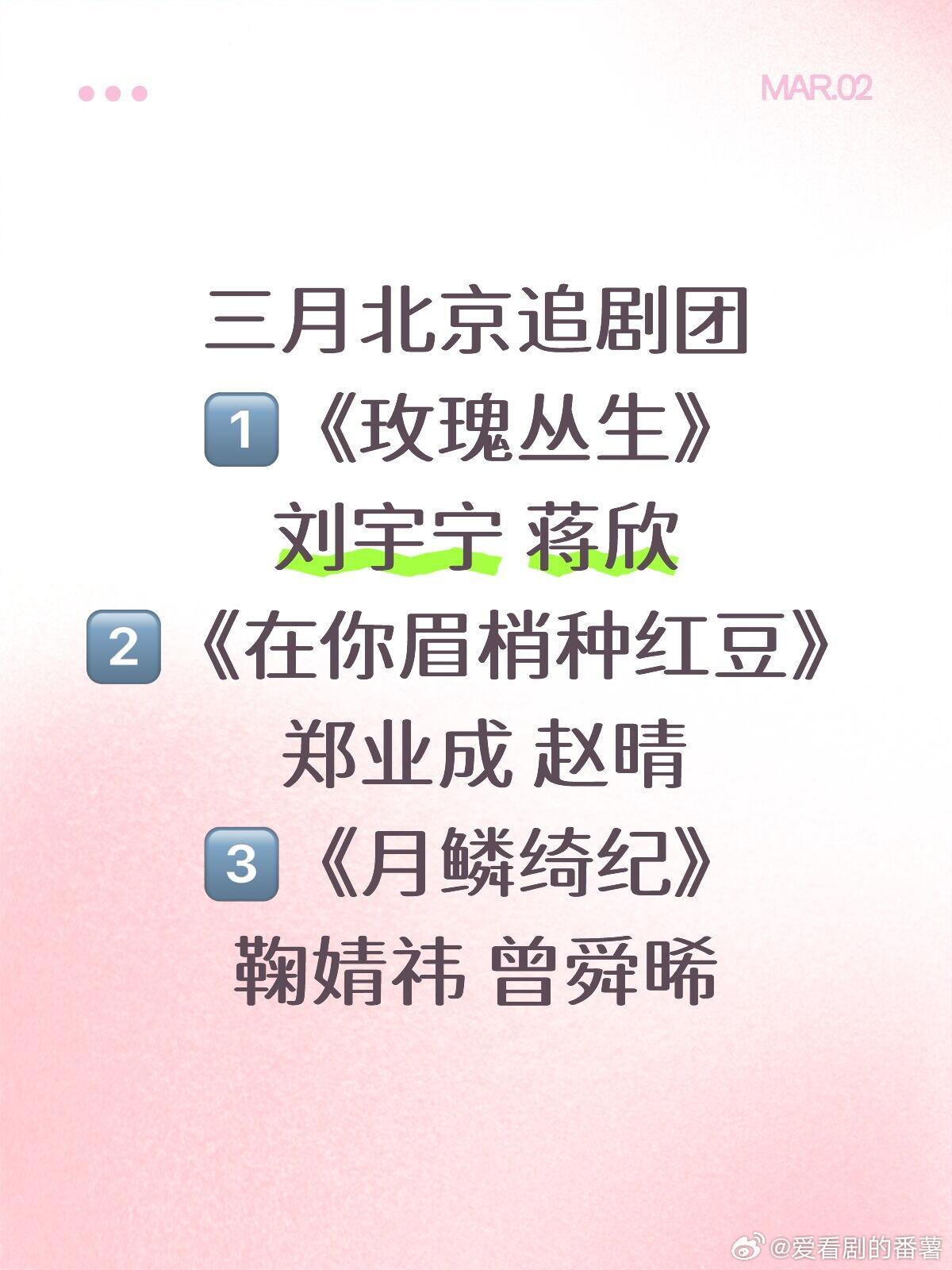 三月北京追剧团1️⃣《玫瑰丛生》刘宇宁 蒋欣2️⃣《在你眉梢种红豆》郑业成 赵晴3️⃣《月鳞绮纪》鞠婧祎 曾舜晞