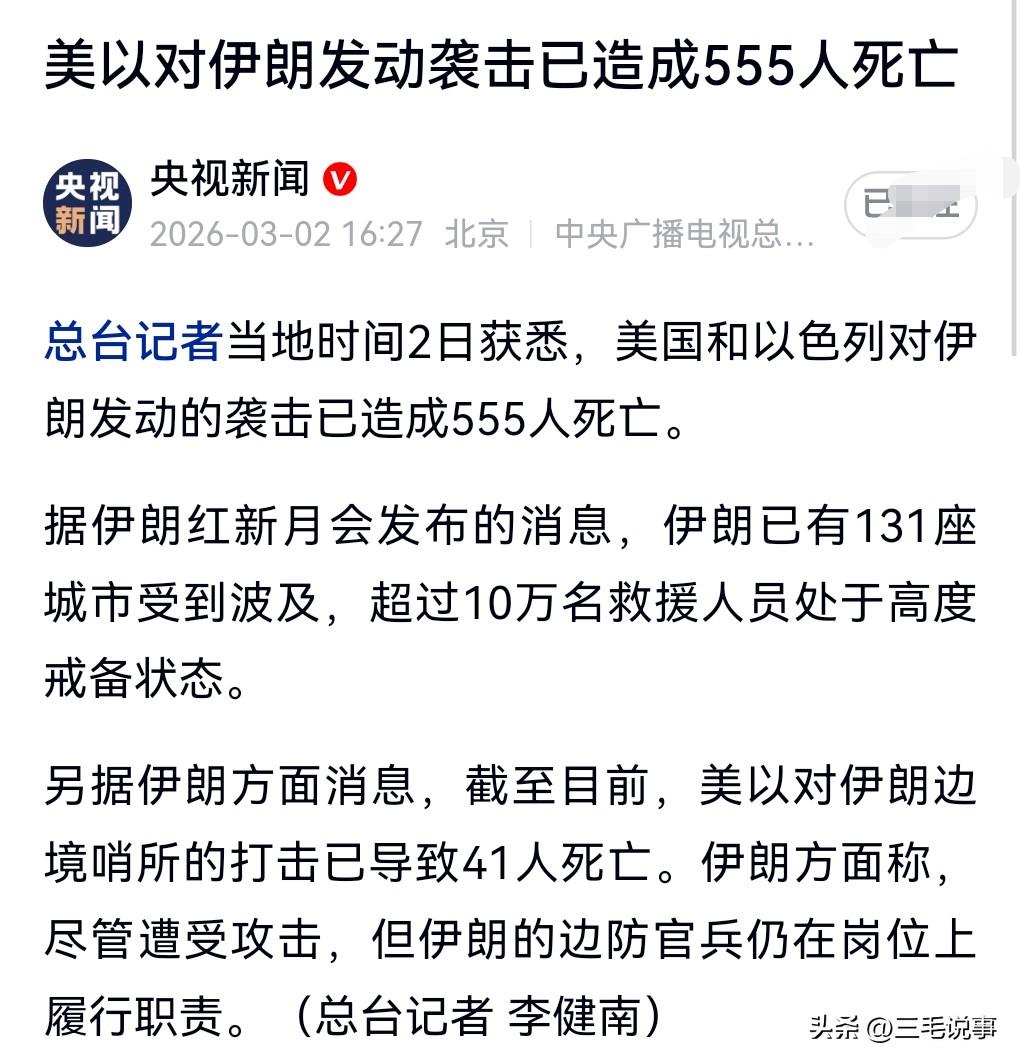 实在是太丧心病狂了,3月2日热搜,美国和以色列对伊朗发动的侵略已经导致伊朗555人死亡。 美国和以色列实在是太丧心病狂了,难道是为了伊朗的石油吗? 并且美国和以色列还希望推翻伊朗政权。 这真的是非常的可怕呀。 颠覆他国的政权,这真是其心可诛啊。