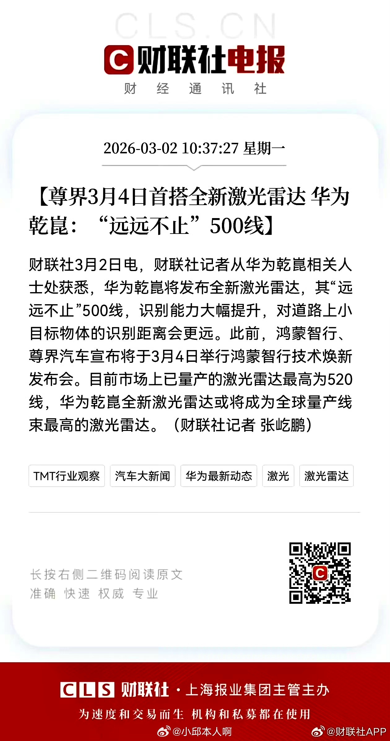 尊界首搭新激光雷达远远不止500线华为乾崑官方人员透露,即将发布的全新激光雷达在垂直分辨率上将实现重大突破,其等效线束将远超500线。这一关键参数的跃升,标志着其点云密度与角分辨率均达到了新的量级,不仅刷新了当前量产激光雷达520线的行业纪录,更有望使其问鼎全球量产最高线束的宝座。