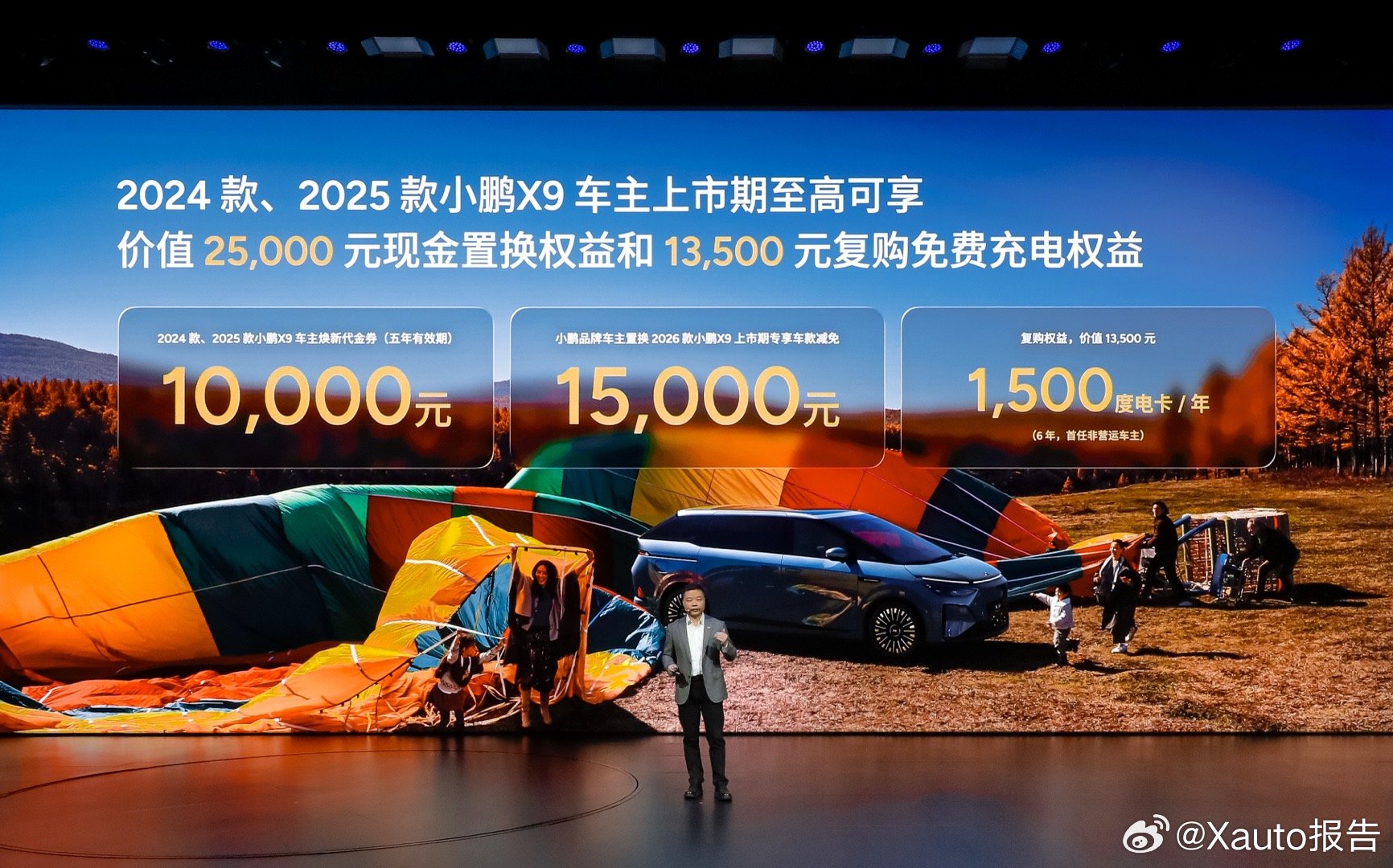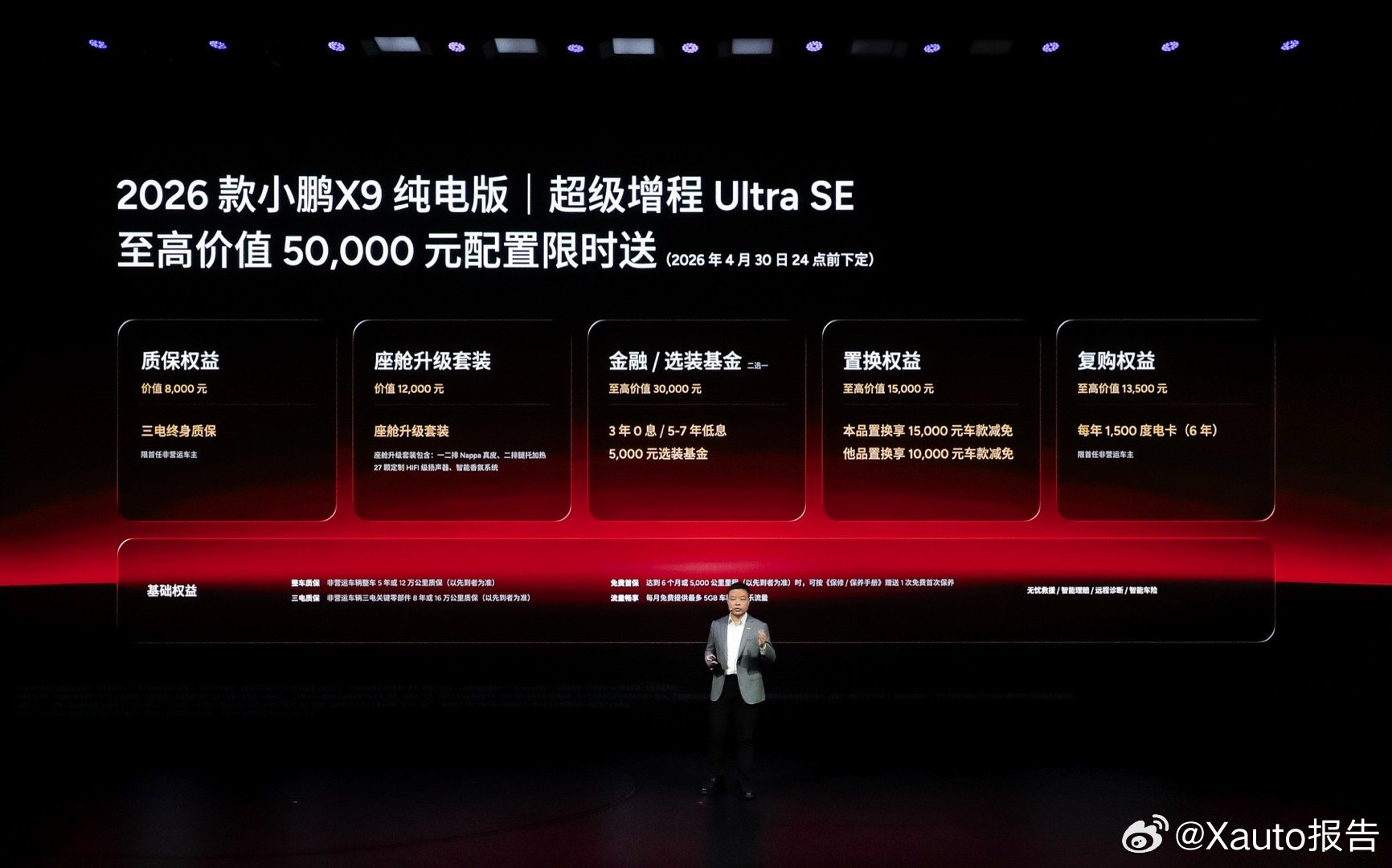 即日起至2026年4月30日24点(含)前下定2026款小鹏X9纯电版,可享最高价值50,000元 权益限时送,包含三电终身质保、价值12,000元的座舱升级套装、至高价值30,000元金融/选装基金、至高价值15,000元置换权益以及每年1500度电卡(6年)的复购权益。