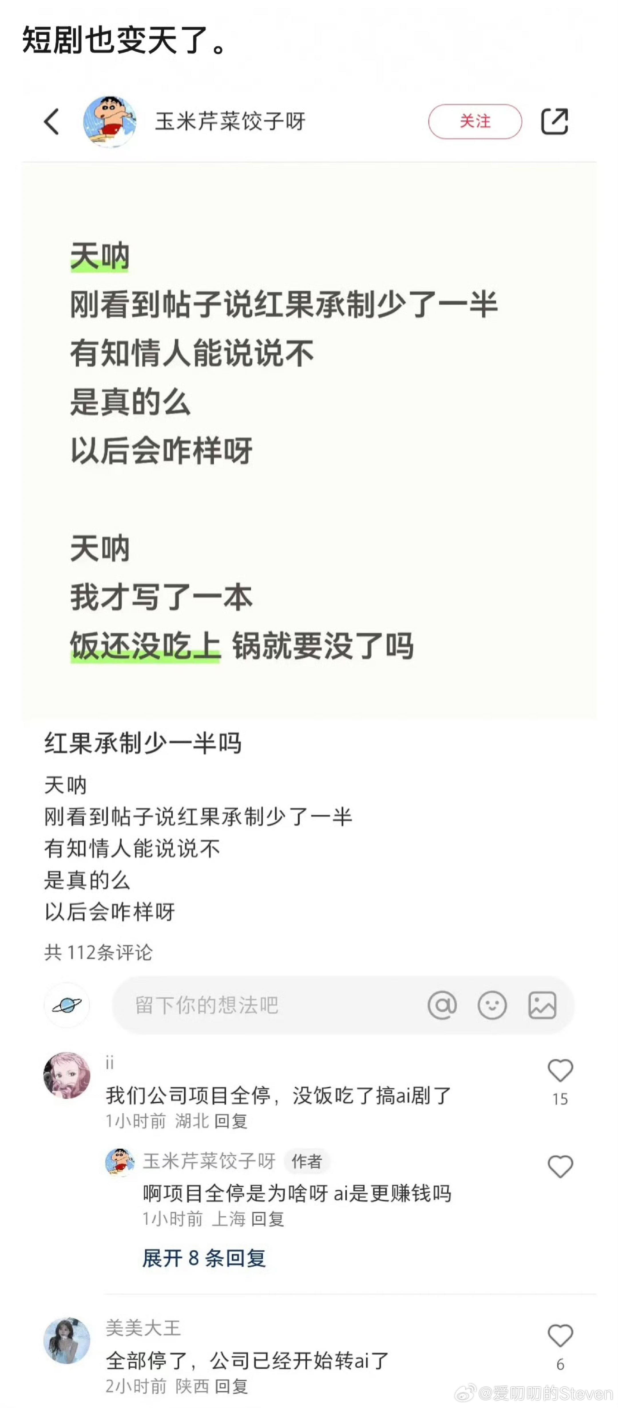 AI短剧没想到来的真的快???没有知名演员一个剧本拍一堆短剧,太适合Ai量产了,下一步可能就是长剧。但是现阶段还是能看出来是不是AI的,一直看眼睛就会觉得很奇怪,有点无神,这一点经常打主机游戏的朋友应该有感觉,CG也是这个问题。但是以现在的发展速度感觉AI很快就能能解决。
