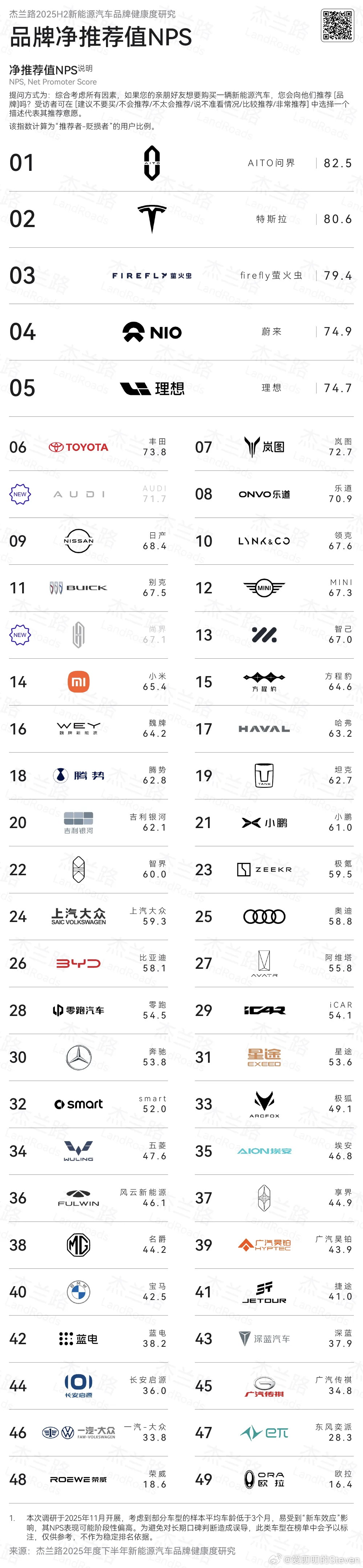 25年下半年,汽车品牌NPS净推荐值问界依然是第一。蔚来4理想5岚图7小米14小鹏21极氪25零跑28奥迪25奔驰30宝马40