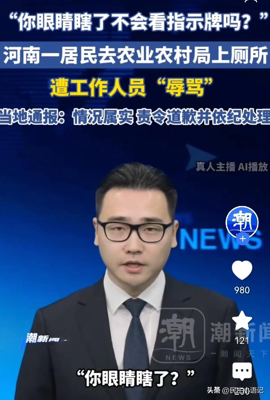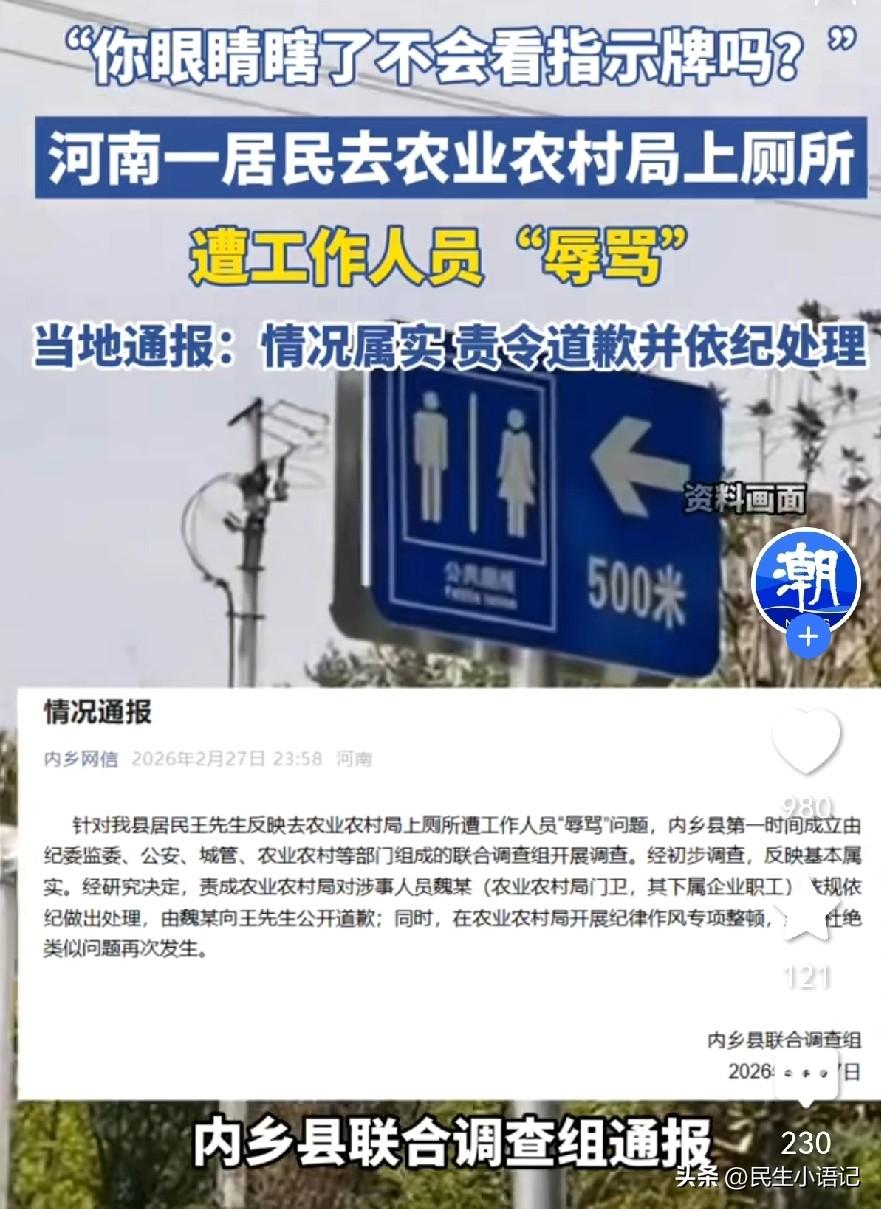 你敢信吗?只是去政府部门借个厕所,竟被工作人员当众辱骂:“你眼睛瞎了,不会看指示牌吗?” 当事人多问一句,对方更是回怼:“我还把你当神敬吗?” 这不是段子,是近日发生在河南内乡的真实一幕。 居民王先生买菜途中突然内急,看到单位门口明明挂着“单位公厕,对外开放”的牌子,才放心进去。他高度近视,当天没戴眼镜,客气询问厕所在哪,换来的却是劈头盖脸的恶语相向。 明明是便民服务,明明是公开的厕所,老百姓正常求助,却要受这种无端的气。 委屈的王先生把此事发布在了网上,立刻引起了舆论,事情闹大后,官方通报来了:承认情况基本属实,责令涉事人员公开道歉、依规处理,并开展作风整顿。 便民不是口号,服务不是形式,一扇门、一个厕所、一句指引,照见的都是最真实的态度。 如果是你遇到这种事,你会选择忍气吞声,还是像王先生一样勇敢曝光?欢迎评论区留下宝贵的意见。 (图片来自网络视频)