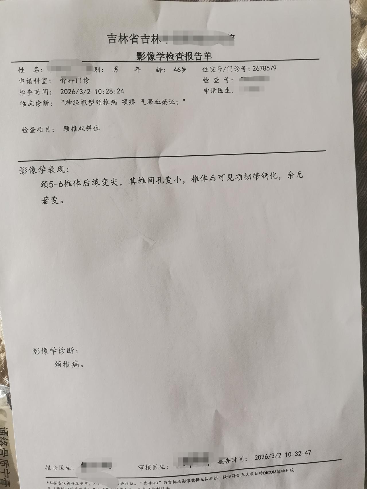 我坐标吉林市,颈椎病实在太折磨人了。今天去医院拍了片子,还好暂时不用手术。 颈椎病真的太遭罪了,吃了一个月药,全然没用。今天我请假去医院拍了片子,结果明确显示是神经根型颈椎病,而且已经钙化,这说明颈椎病已经存在很长时间了。我自己竟毫无察觉,以前只是脖子僵硬,还以为是落枕,根本没当回事。这次病情又加重了,颈椎压迫神经,导致胳膊疼、手指麻,呈放射性疼痛。真的太难熬了,严重影响了工作和生活。生活质量大幅下降,疼起来时,我什么心情都没有,工作也不上心,所有副业都停了。 今天去医院时,我都做好做手术的准备了。好在拍完片子,医生说还没到手术的地步,可以采取保守治疗。医生开了些膏药和药,还让配合针灸、牵引、热敷等辅助疗法。并且嘱咐我不能低头看手机、不能打麻将、不能长时间开车,还要锻炼颈椎,总之麻烦得很,但为了健康也只能坚持。 这颈椎病是年前发作的,到现在快一个月了。希望这次能有所缓解,不奢望彻底根治,只盼着这些症状能消失,和这病和平共处吧。所以大家一定要爱护好颈椎,千万别得这病,真的太遭罪了!