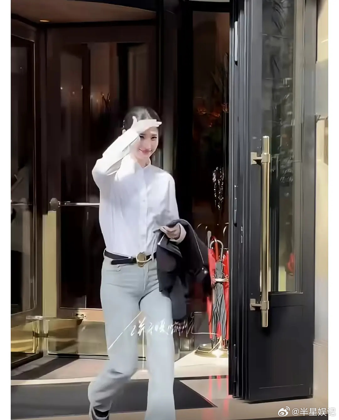 刘亦菲这条裤子挺养生,毕竟降温了肚脐眼必须护住啊