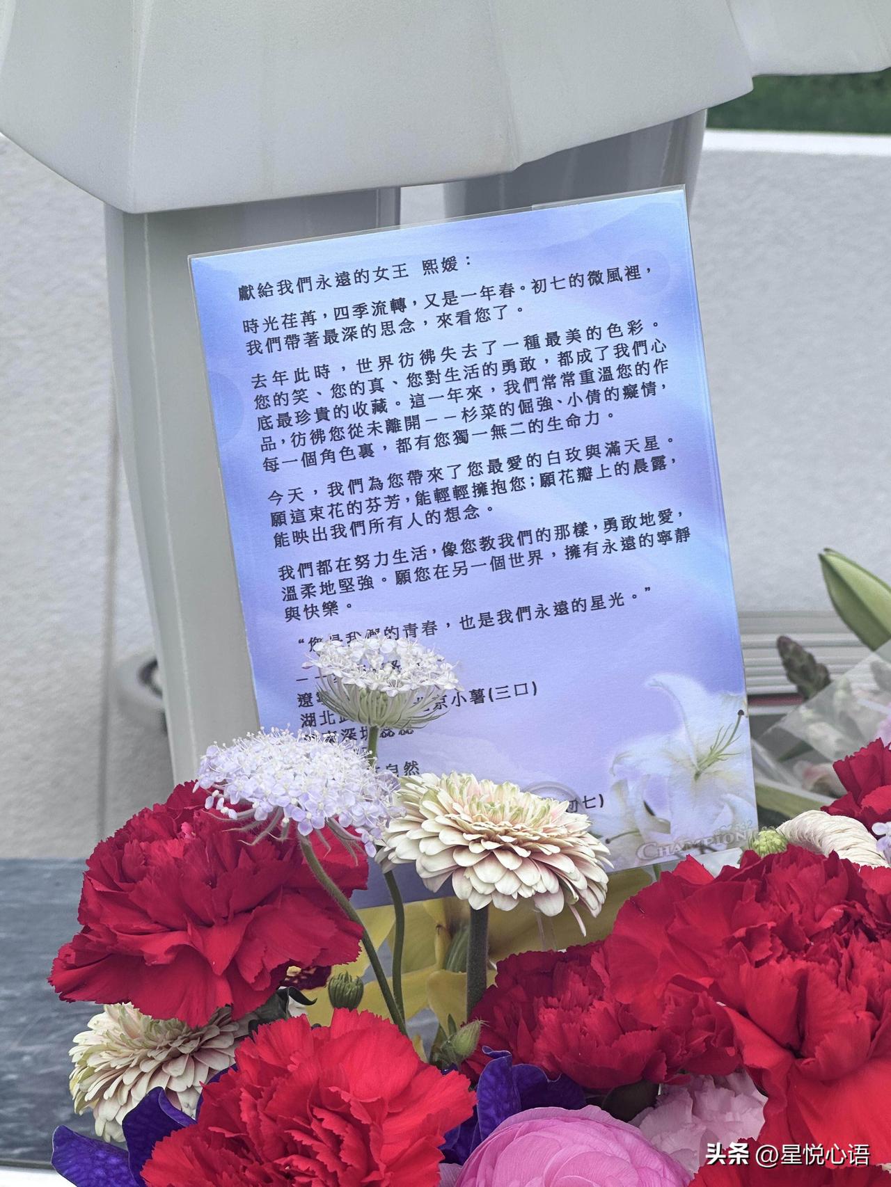 终于能来大宝山看大S了 一晃一年,又到了想念大S徐熙媛的日子。 从流星花园的杉菜开始, 她就走进了好多人的青春岁月里。 她演的角色鲜活,生活里也活得果敢又真实,教我们勇敢爱、坚强活。 带着她爱的白玫和满天星去看她。 近距离看雕像质感很好,是大S青春的模样…… 她的爱人用专属的雕塑, 给她留了一份永远的思念,爱从未离开。 熙媛从来都不是消失了, 只是换了个地方好好生活。 愿她在那边无病无灾, 永远平安快乐,我们会一直记得她。