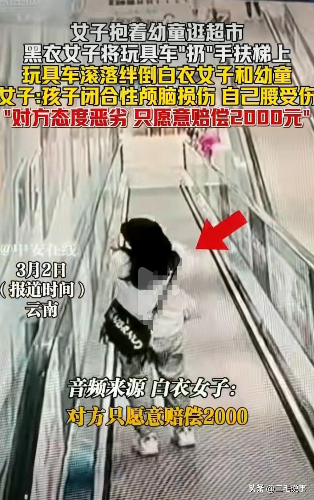 既然谈不拢的话,那就只有法律起诉了。 3月2日(报道),云南,一女子抱着婴儿坐手扶梯。 后面的黑衣女子将玩具车放扶手梯上。 结果这车滚下去,使得前面的母婴摔倒受伤。 女子称孩子闭合性颅脑损伤,自己腰部也受伤。 女子说黑衣女子态度恶劣,只赔2000。 女子说连检查费都不够。 只有起诉法律了,听从法院判决,该赔多少就赔多少,2000块钱肯定太少了。