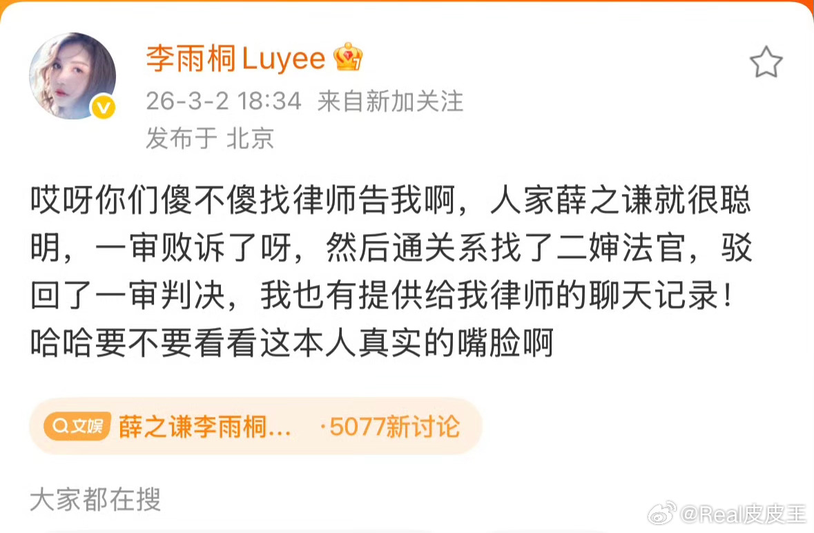 李雨桐再度强调,薛之谦一审败诉了,然后通关系找了二审法官……