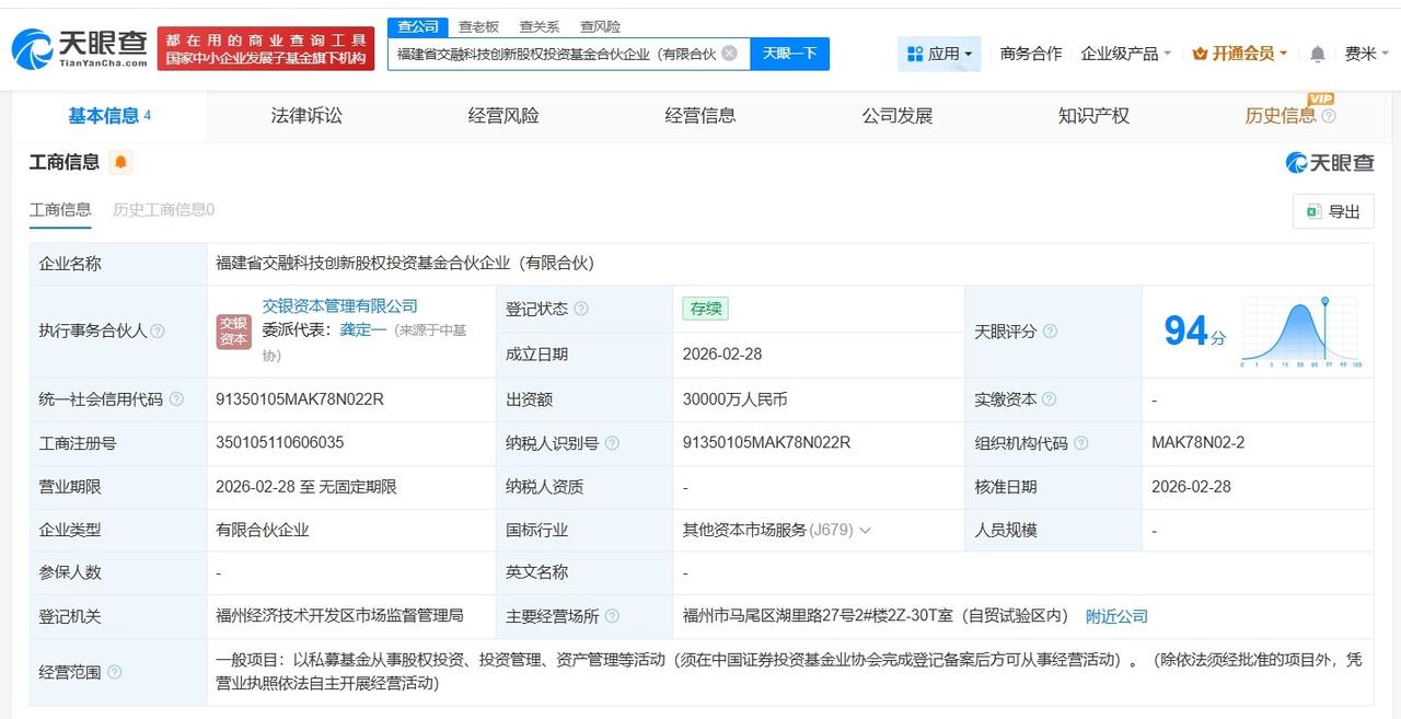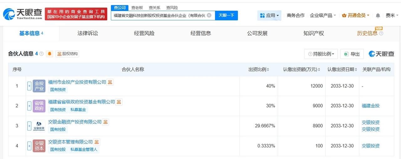 福建省交融科技创新股权投资基金成立 出资额3亿 天眼查App显示,近日,福建省交融科技创新股权投资基金合伙企业(有限合伙)成立,执行事务合伙人为交银资本管理有限公司,出资额3亿人民币,经营范围为以私募基金从事股权投资、投资管理、资产管理等活动,由福州市金投产业投资有限公司、福建省省级政府投资基金有限公司、交银金融资产投资有限公司、交银资本管理有限公司共同出资。 天眼查信息: