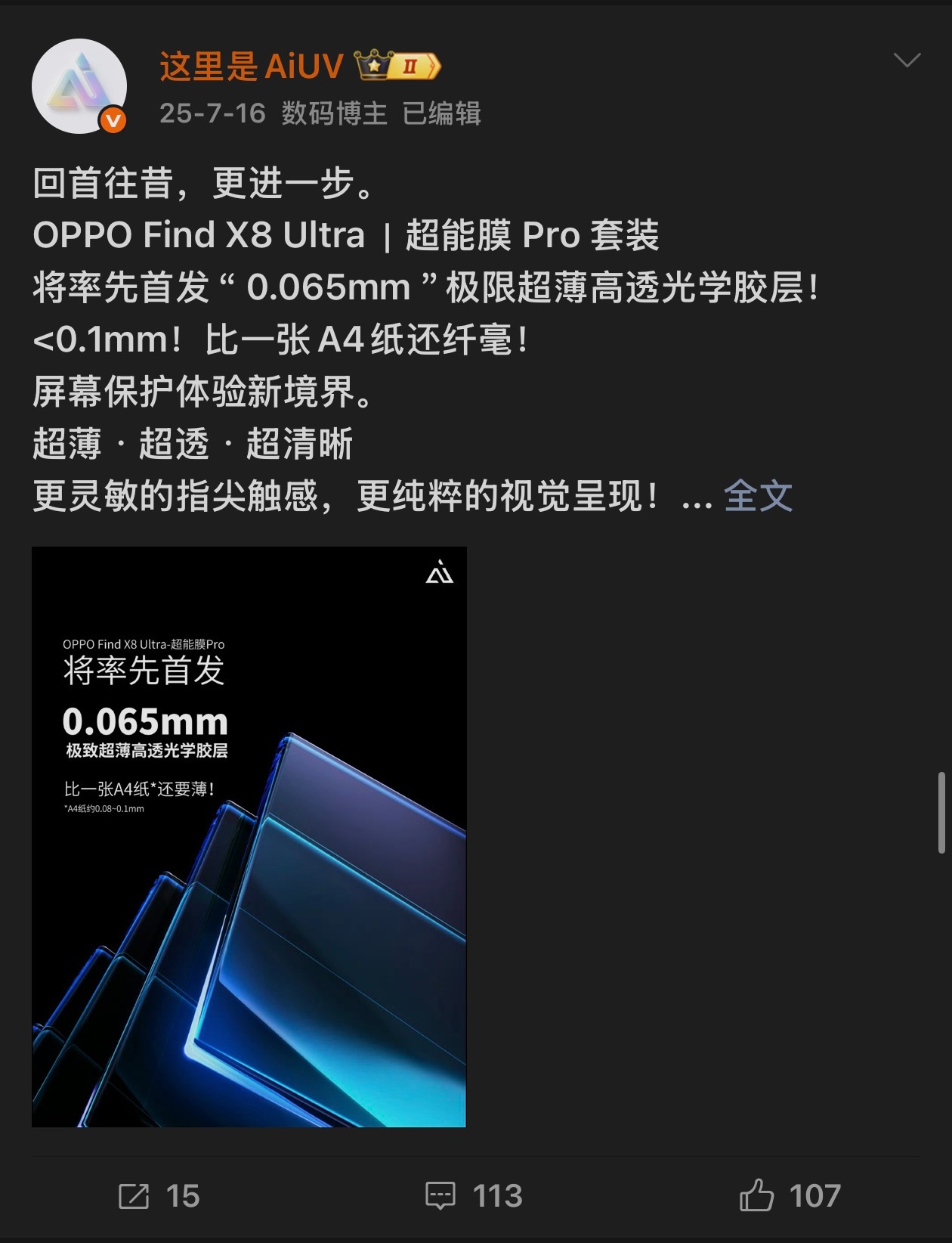 去年 7 月,我们在 OPPO Find X8 Ultra 上行业首发应用了当时最新的 0.065 mm 超纤薄高透胶层(后面都说 0.06mm 了,省略了 0.005mm) 。得益于其优异的性能参数,无论是透光率还是触控响应表现都十分出色。虽然产品早在去年 7 月发布,但在打磨过程中经历了多轮反复验证与优化。所幸最终不负投入,这款产品不仅获得了市场认可,后面也逐渐成为行业里部分高端贴膜产品的“标配”方案